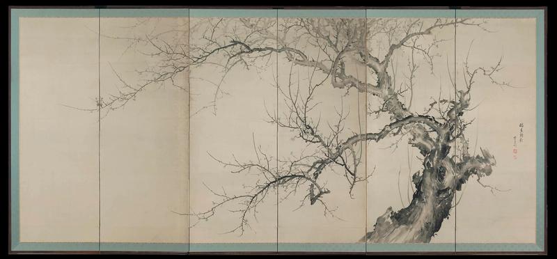 A pair of six-fold paper screens painted in ink on a buff ground with shochikubai (The Three Friends in Winter). The right-hand screen shows the moon behind a gnarled old plum tree and the left-hand screen has a snow covered pine tree and bamboo.