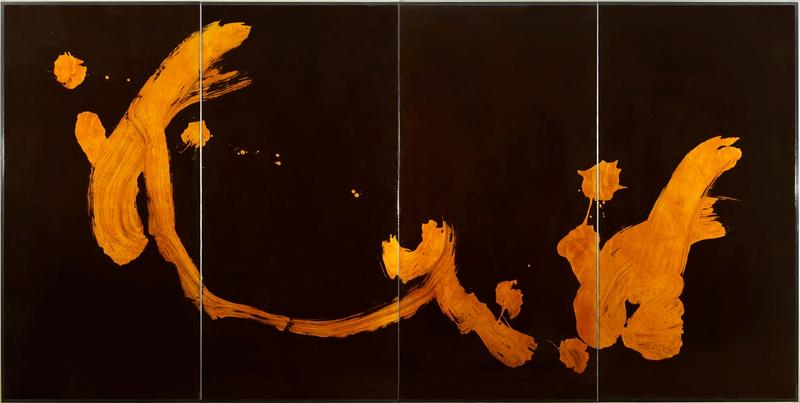 In terms of style and format, Morita Shiryū’s works are groundbreaking. He preferred to use an oversized brush, working quickly across the surface. Whilst works such as the example presented here may appear to be executed using the rather slow process of Japanese lacquer, in actuality the metallic silver paint is applied swiftly onto the surface and later covered with a coat of fast drying yellow varnish achieving a similar effect. Morita’s vigorous style often results in abstract forms which no longer appear to be recognisable characters yet they retain their original essence enhanced with a new vitality.