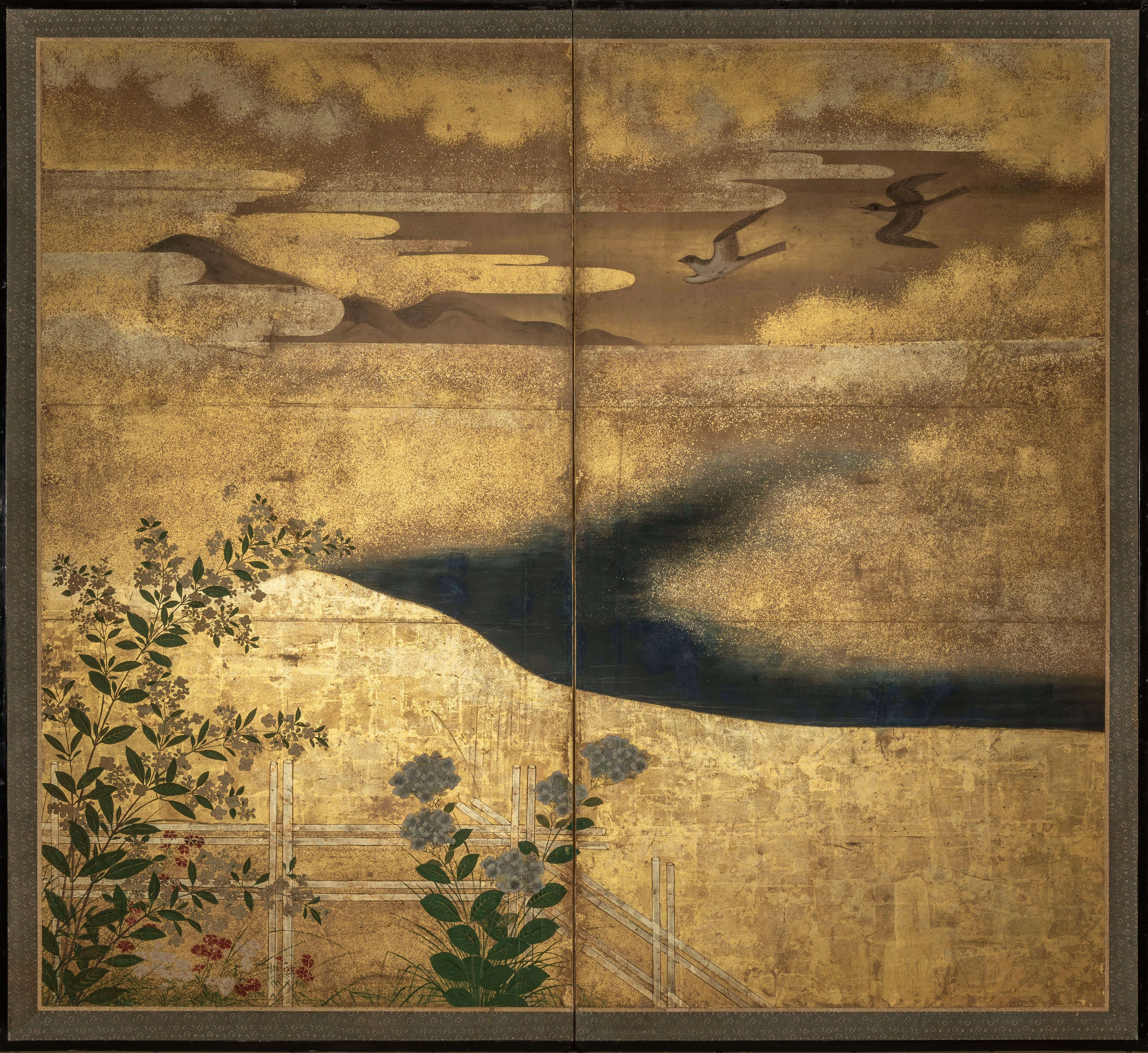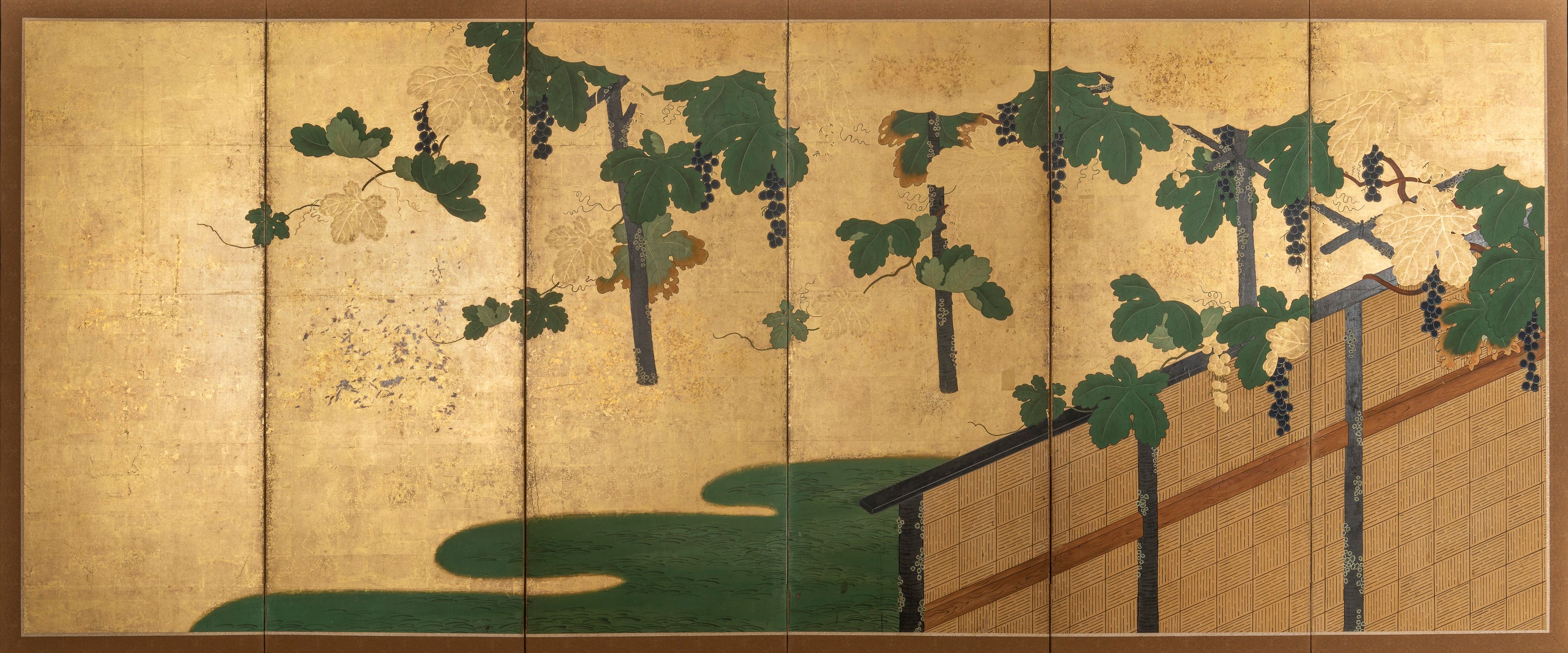 Un écran de papier à six volets peint à l'encre et en couleur sur fond d'or avec des vignes suspendues à une pergola et à une clôture tressée parmi des nuages dorés, les détails en gin-sunago (feuille d'argent découpée) et en moriage (motif en relief).