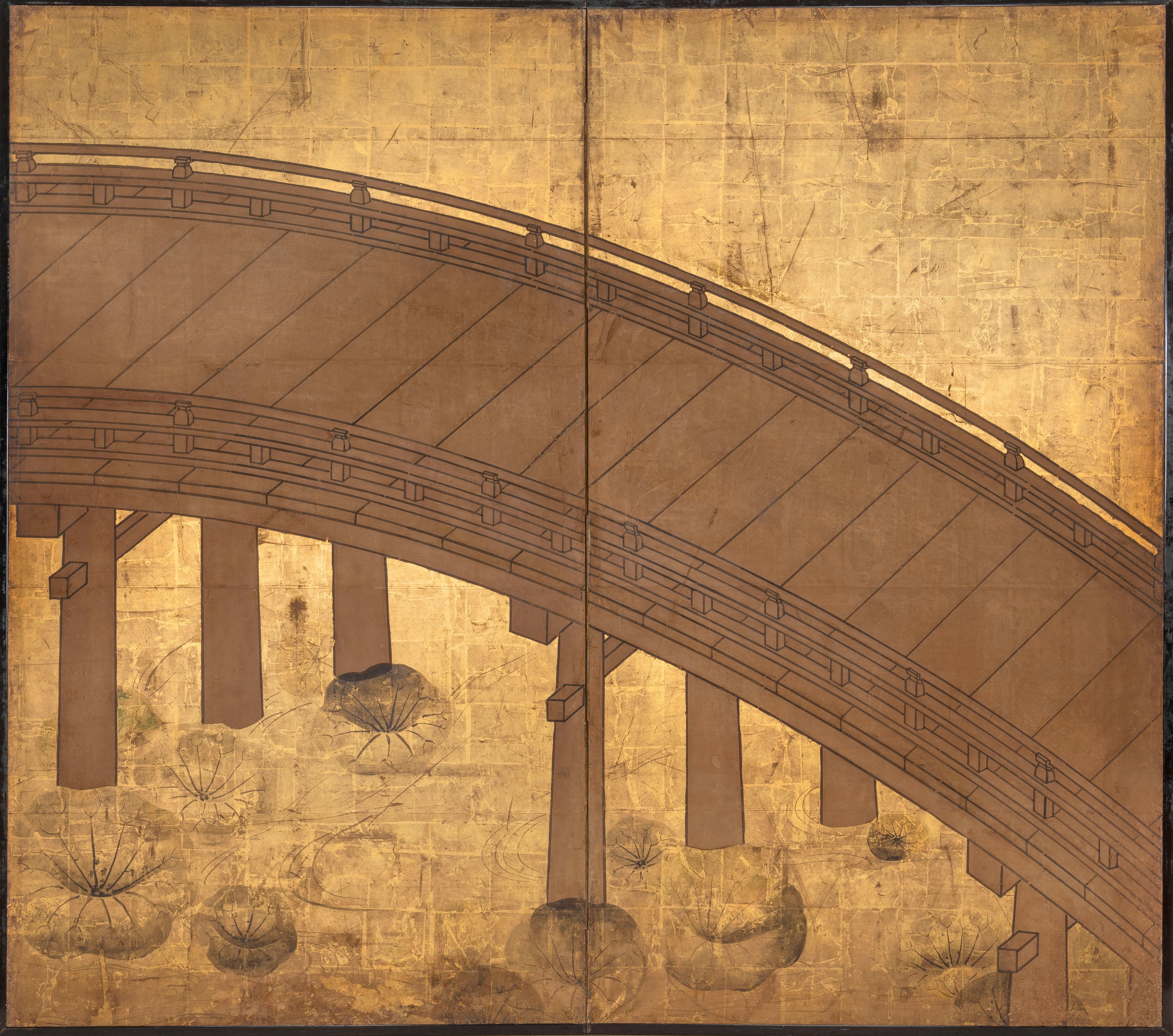 Un double écran de papier peint à l'encre et à la couleur sur fond d'or avec la rivière Uji et des lotus sous son célèbre pont.