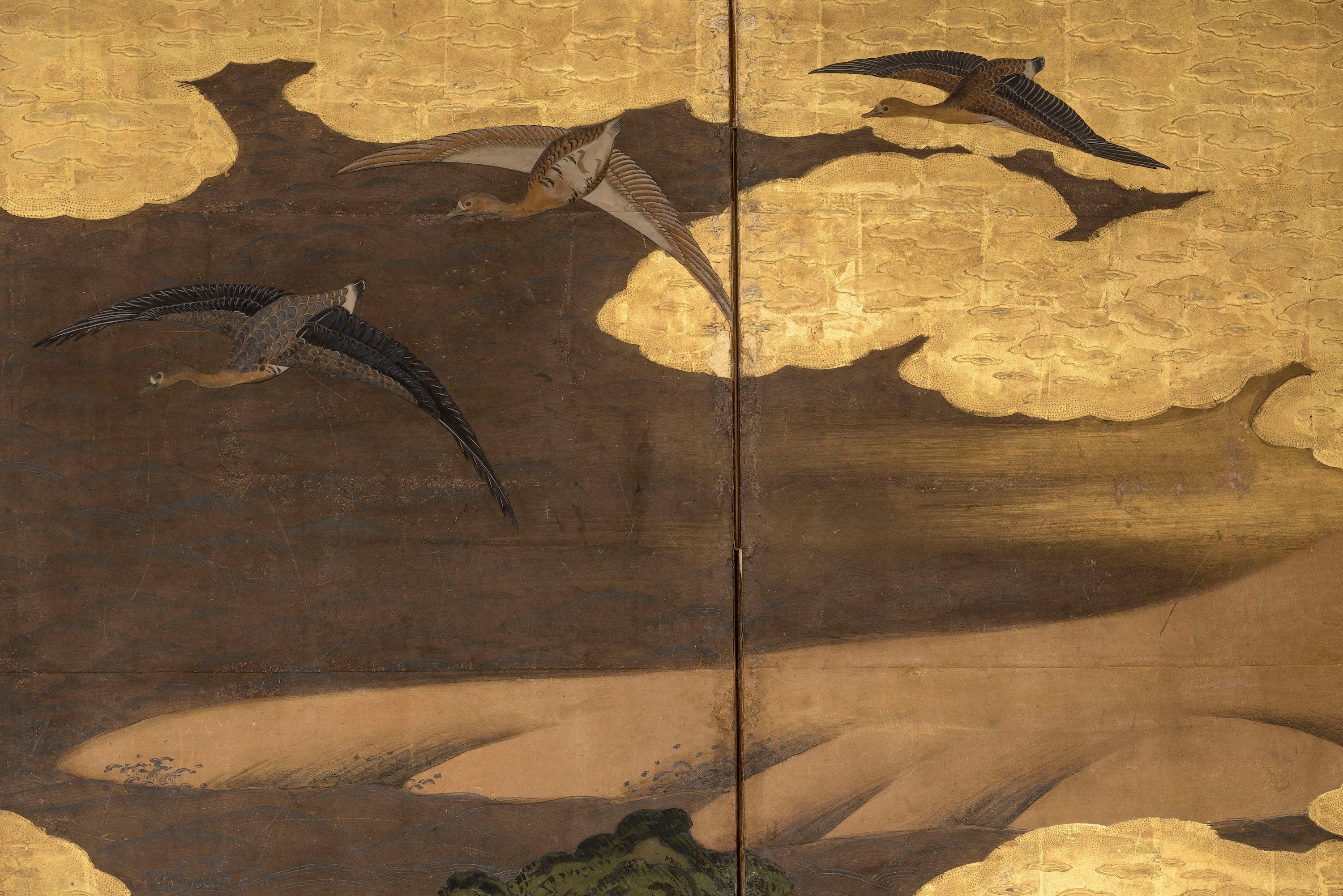 SOLD _ Un écran de papier à six volets peint à l'encre, à la couleur, au gofun (coquillage en poudre), à la feuille d'argent et à la feuille d'or, représentant des conifères et des érables en automne près de la rivière Tatsuta, avec trois oies en vol parmi des nuages dorés rendus en moriage (motif en relief).