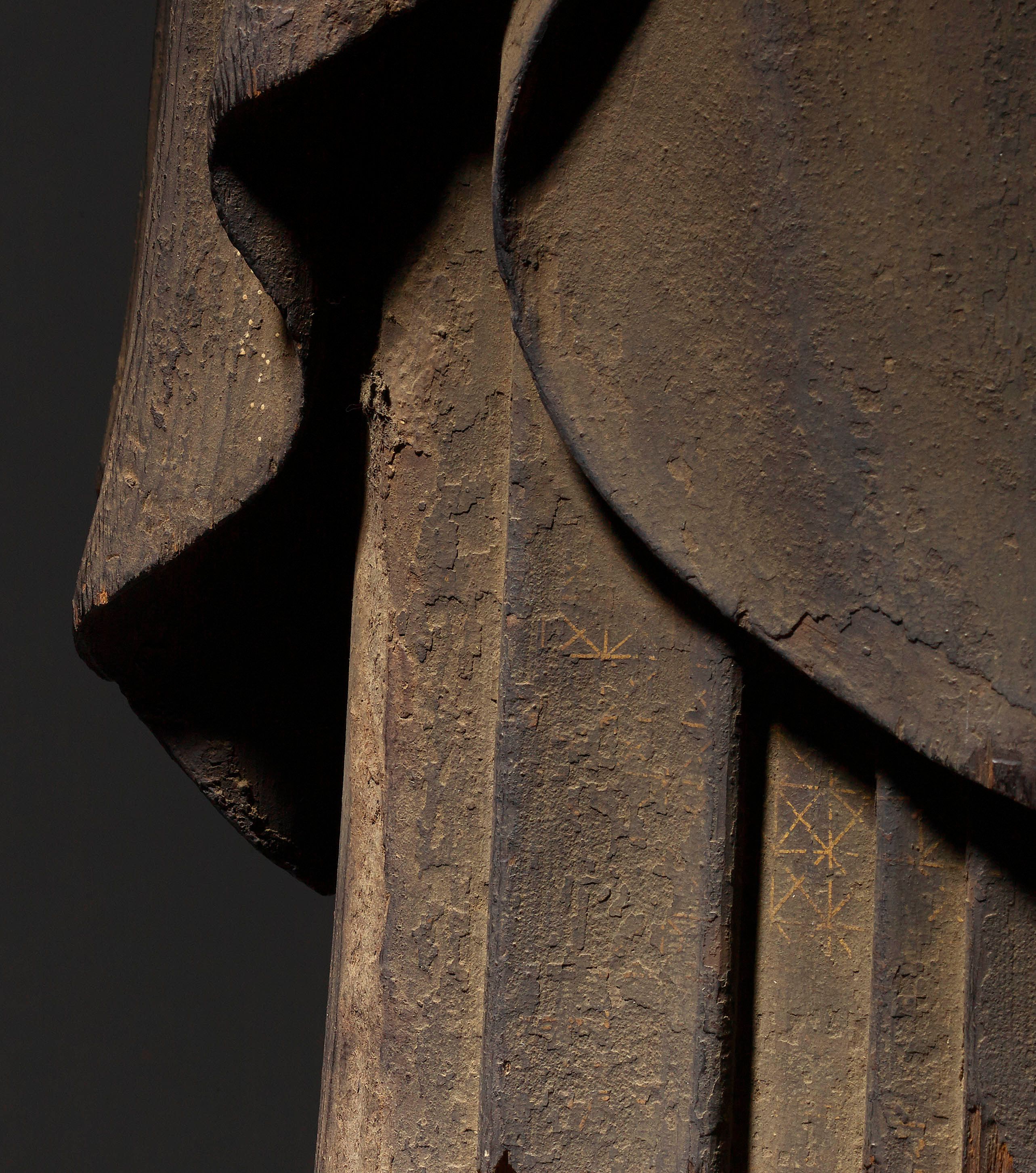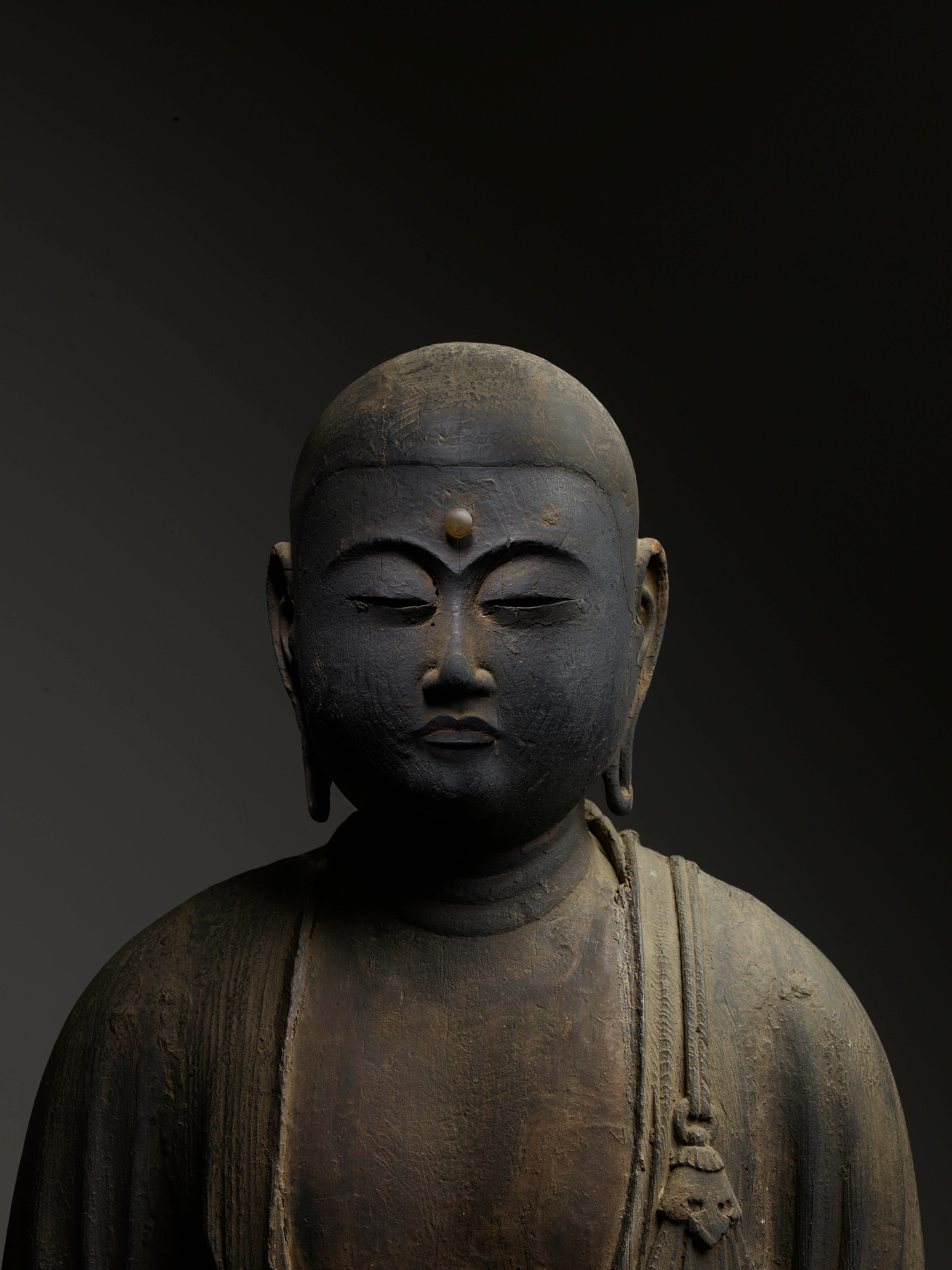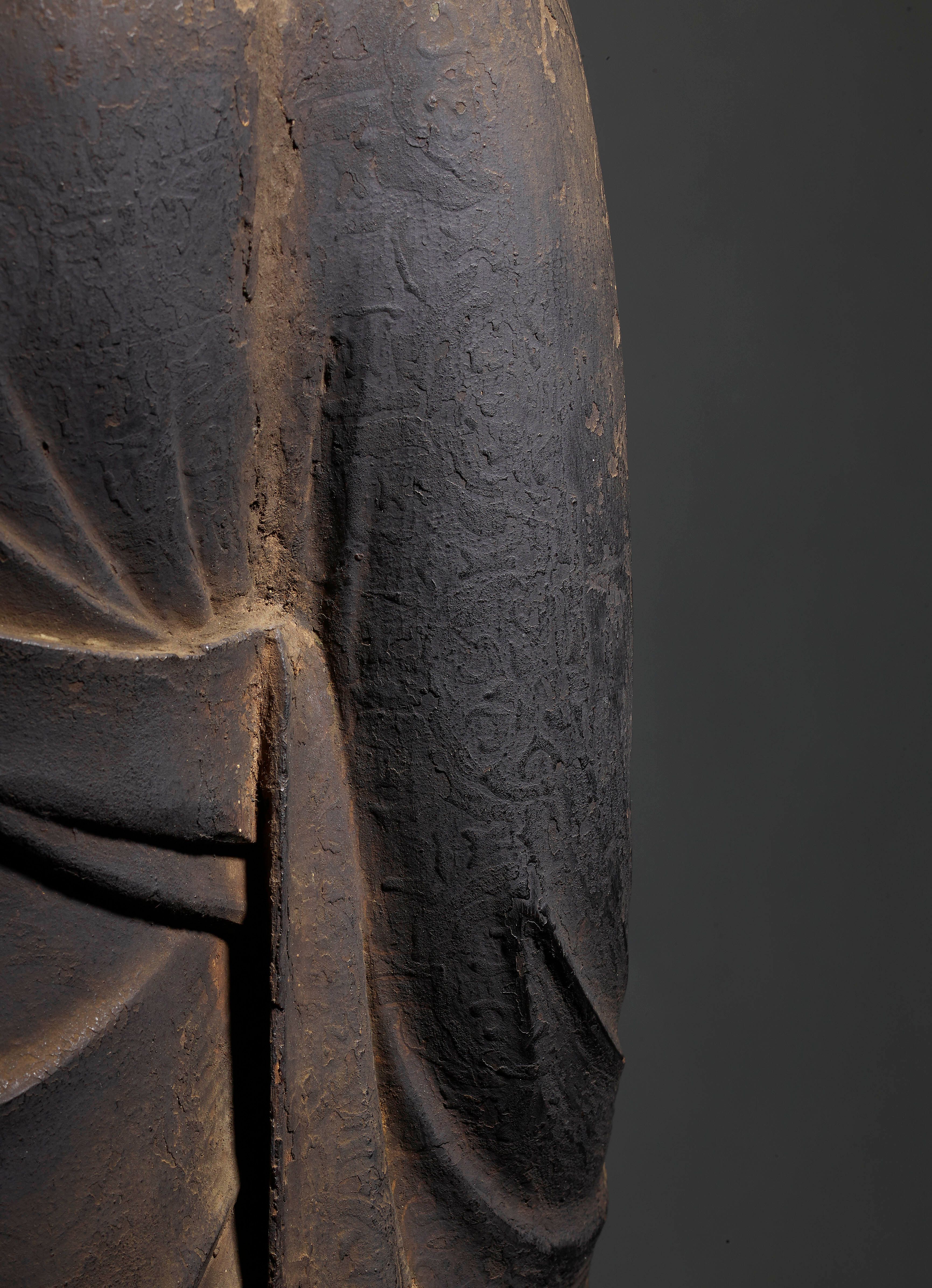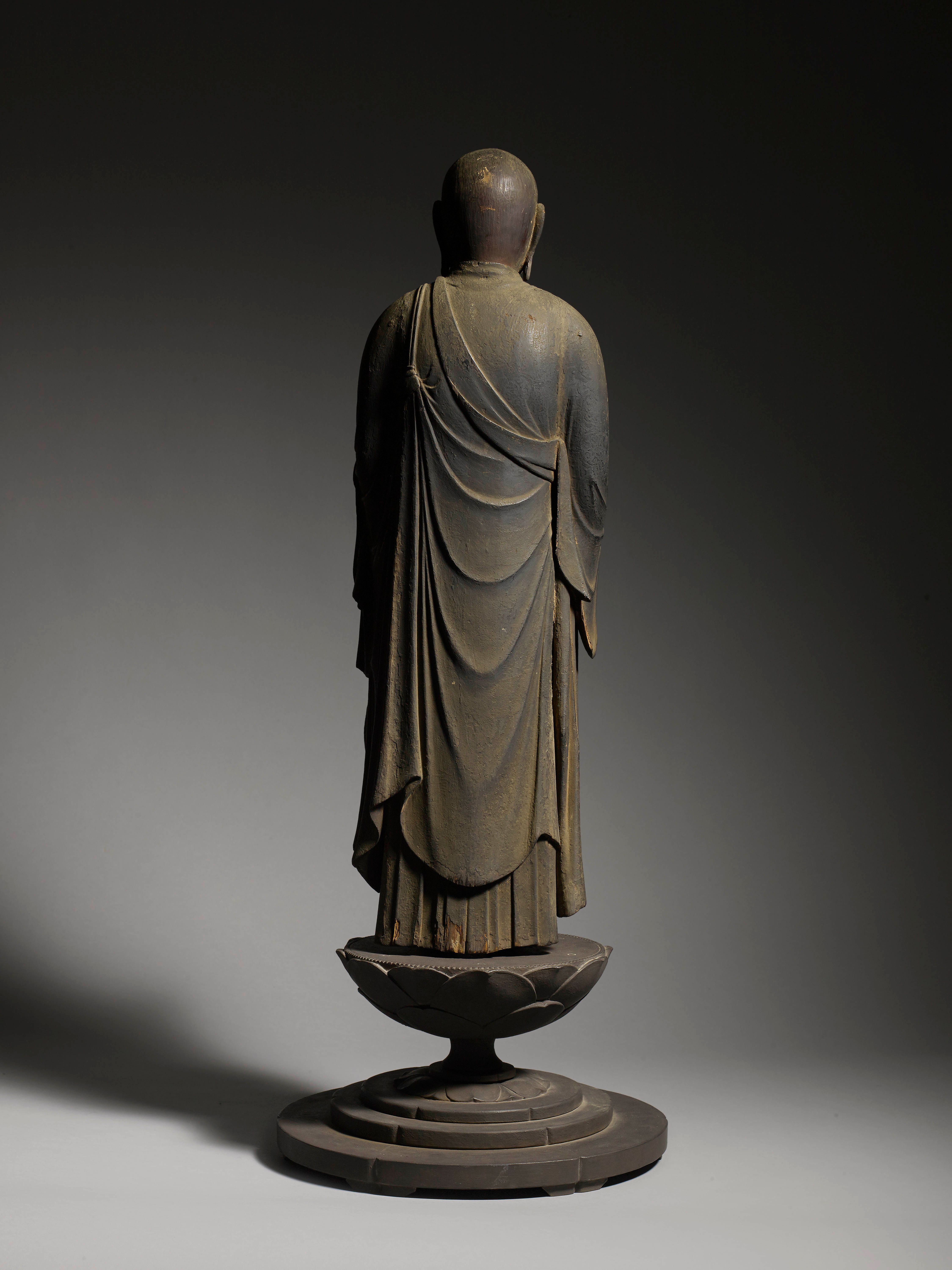 La première phase, l'âge de Shōbō, devait durer 1 000 ans après la mort du Bouddha. On croyait qu'il s'agissait d'une période dorée durant laquelle les adeptes avaient la capacité de comprendre le Dharma. La deuxième phase, l'âge de Zōhō, devait également durer 1 000 ans, au cours desquels la pratique bouddhiste commencerait à s'affaiblir. La troisième et dernière phase, l'âge de Mappō, d'une durée de 3 000 ans, a vu la foi bouddhiste se détériorer et ne plus être pratiquée. Au Japon, l'âge de Mappō aurait commencé en 1052 après J.-C., et un sentiment d'inquiétude a alors envahi le pays, les gens de toutes les classes sociales aspirant au salut. Le traitement naturaliste de la figure représentée ici découle d'une tradition de la sculpture japonaise de portrait qui s'est développée dans un contexte bouddhiste et n'a jamais été complètement séparée du cadre religieux. Dès la période Nara (645-781), la majorité des sujets représentés étaient des personnages religieux, légendaires ou historiques. Les portraits de moines vénérés, qui constituent l'essentiel de la sculpture portraitiste japonaise, étaient appréciés en tant qu'objets de valeur esthétique et étaient populaires surtout à partir de la période Kamakura (1185-1333). Cette tradition de représentation naturaliste se retrouve également dans les sculptures de divinités bouddhistes produites à l'époque.