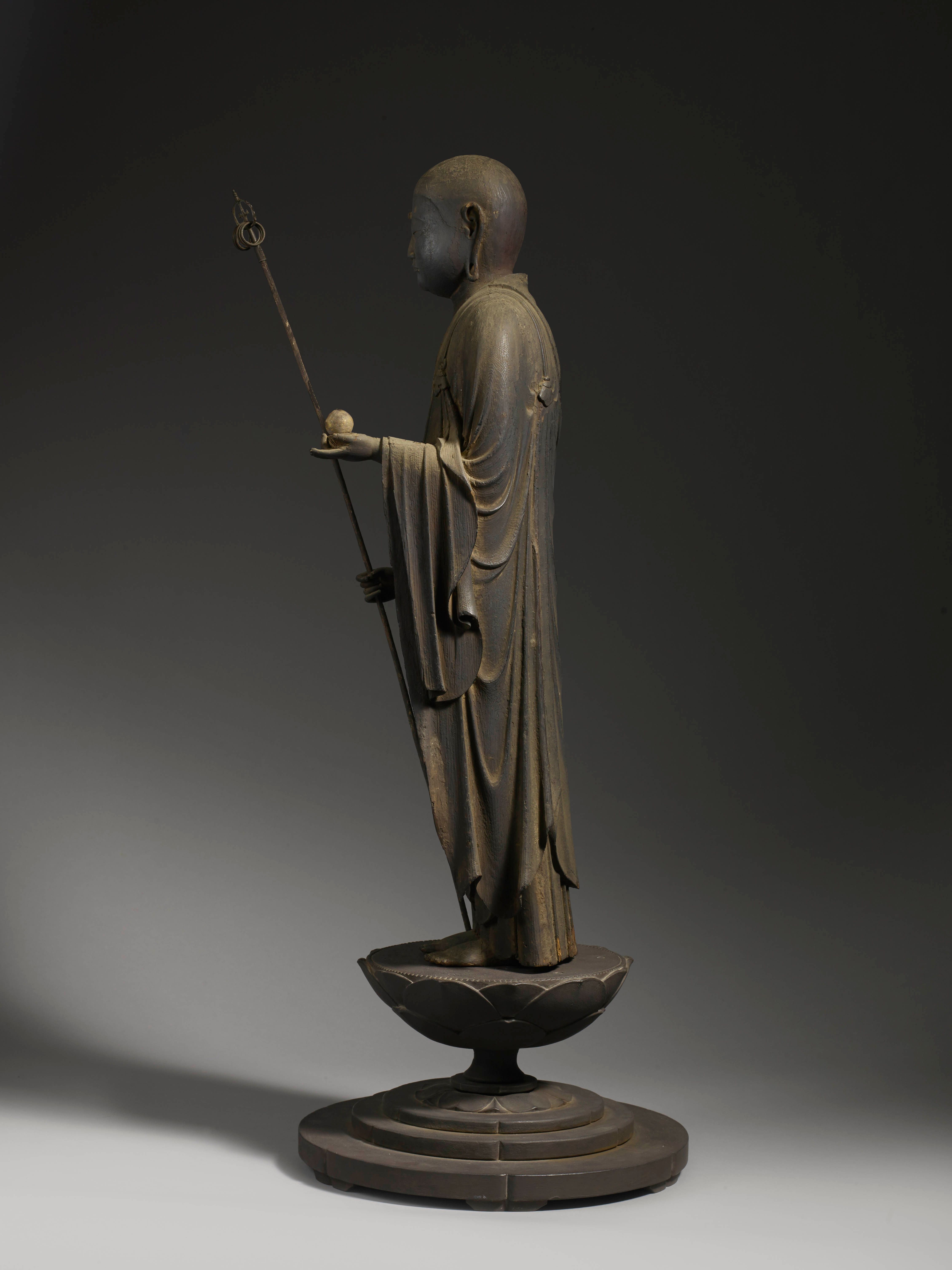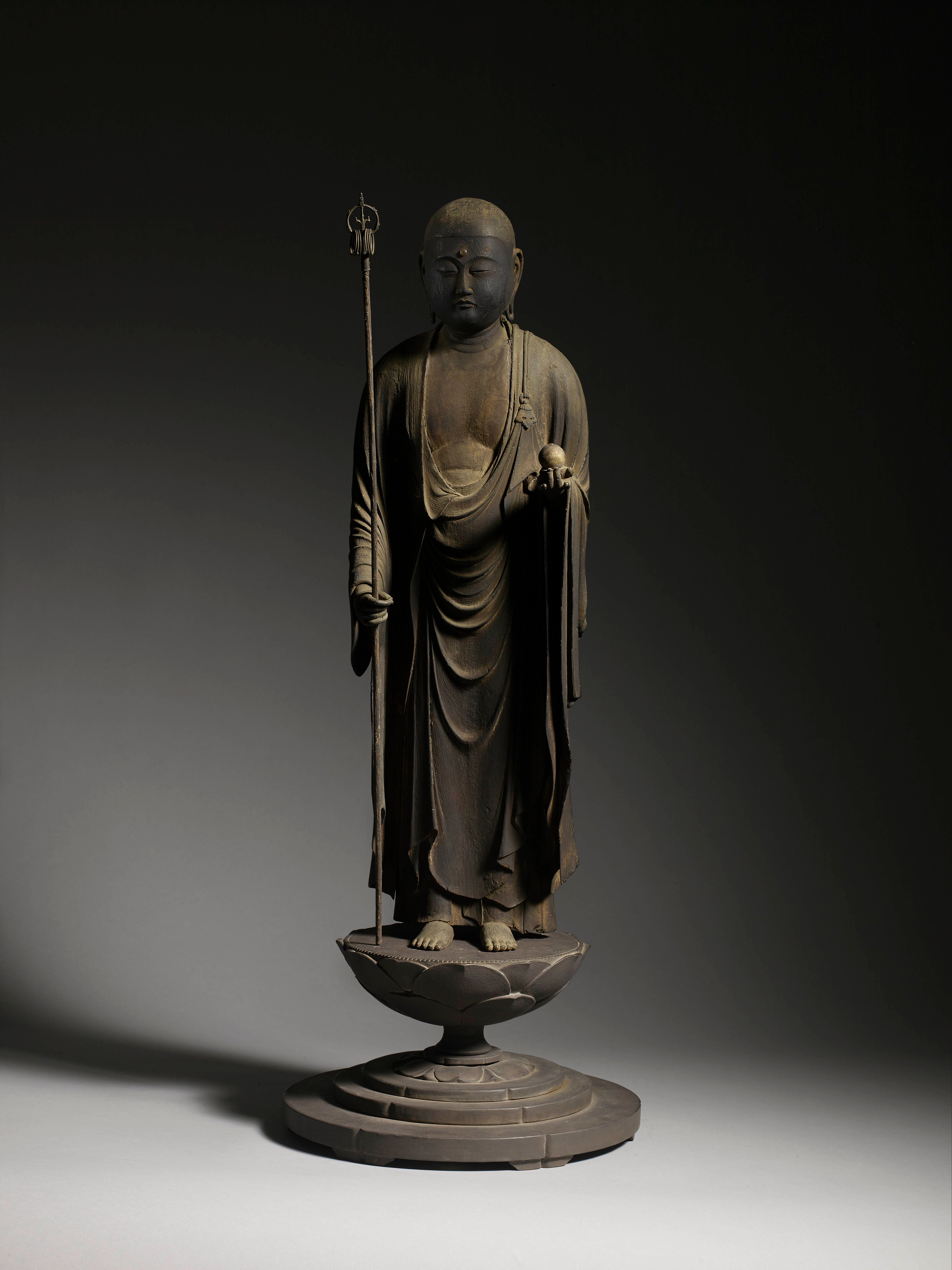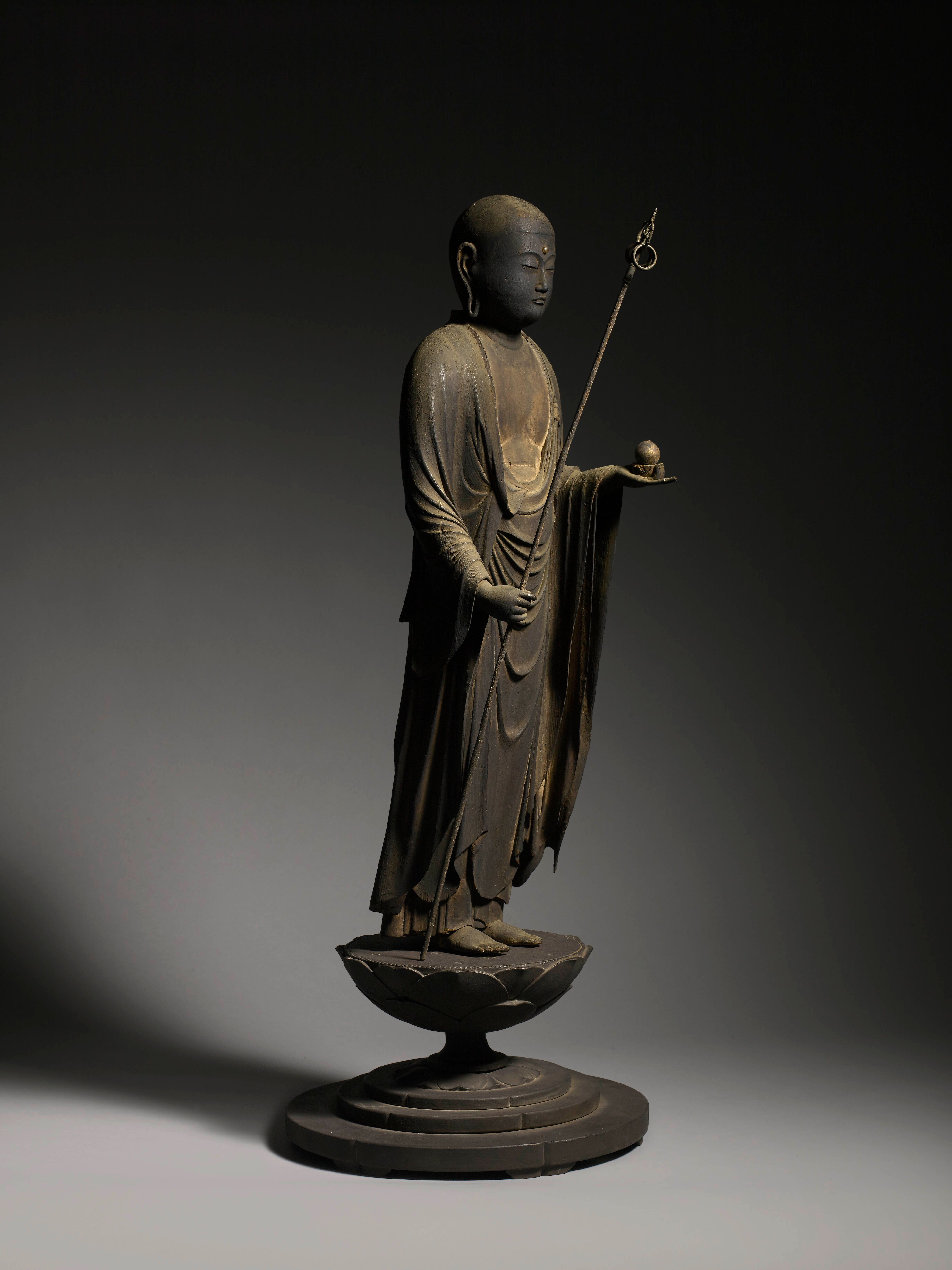 Figurine en bois sculptée représentant Jizō Bosatsu, avec un shakujō (bâton de prêtre) dans la main droite et un nyoi-hōju (bijou exauçant les souhaits) dans la main gauche, debout sur une base en lotus.