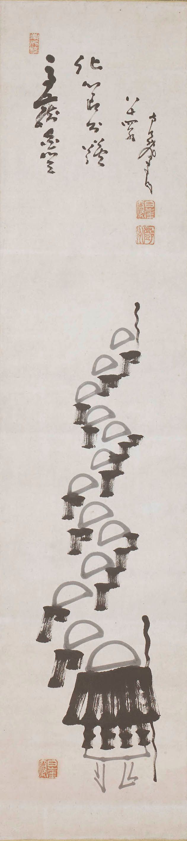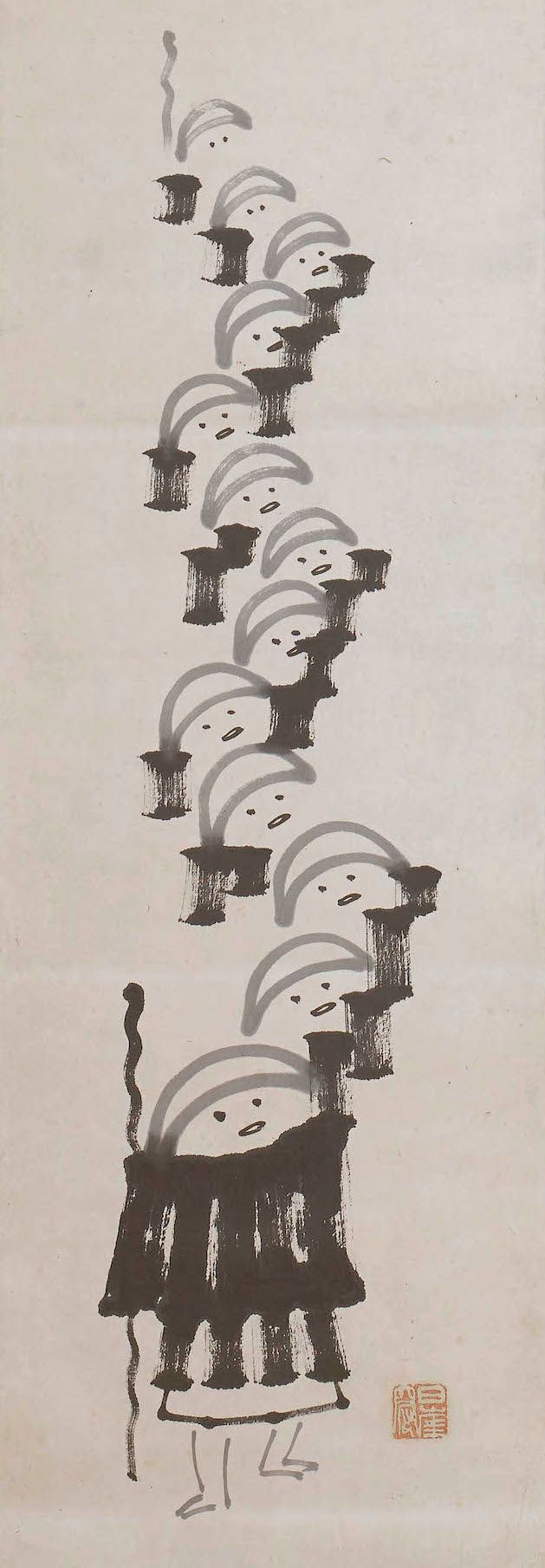 Paire de kakemono (rouleaux suspendus) peints à l'encre et calligraphiés, représentant des moines itinérants et mendiants en procession