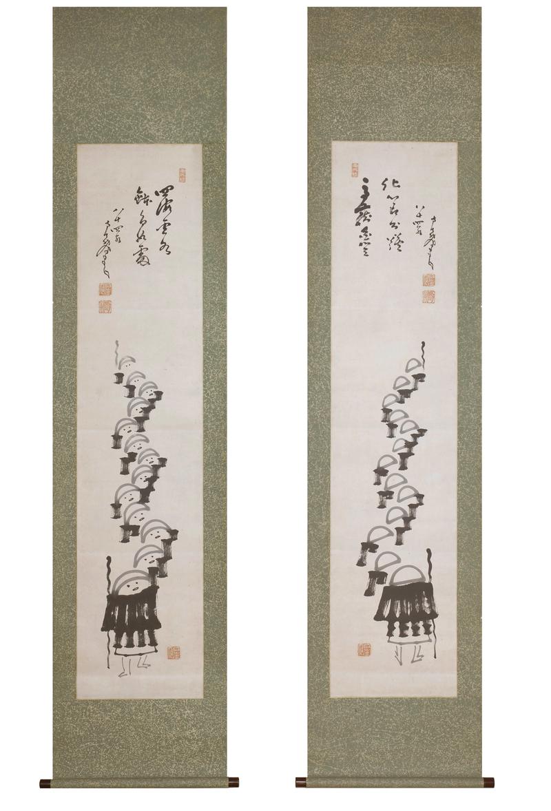 Paire de kakemono (rouleaux suspendus) peints à l'encre et calligraphiés, représentant des moines itinérants et mendiants en procession.
