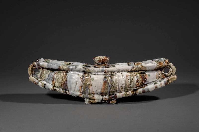 La poterie brute est recouverte d'une épaisse glaçure cendrée verte, brune et blanche.