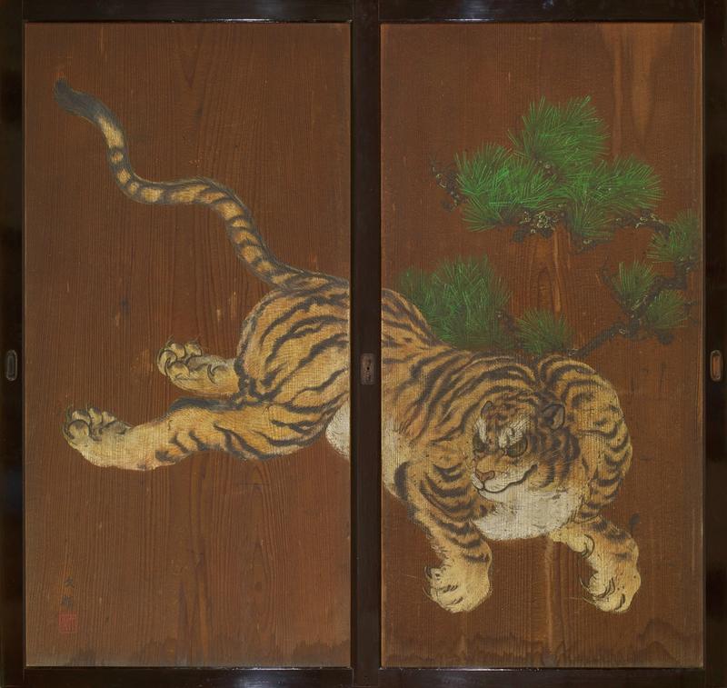 Paire de sugido (portes en bois de cèdre) peintes à l'encre et en couleur sur les deux faces. L'une des faces représente un tigre sous un pin et l'autre deux chevaux debout sous une glycine.