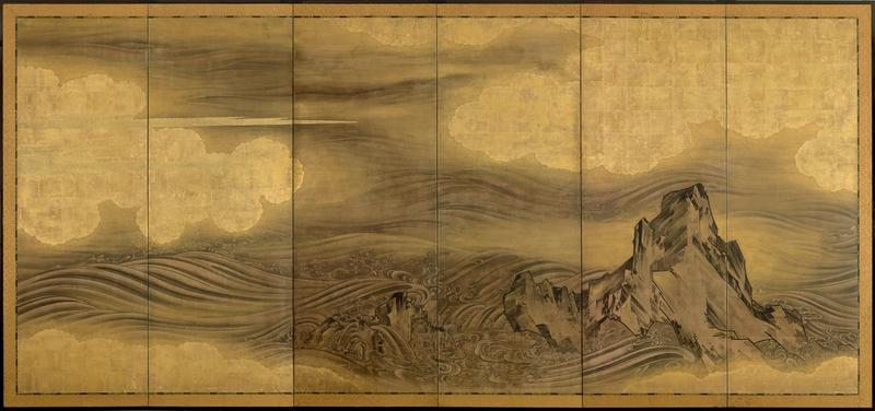 Paire de paravents à six volets peints à l'encre sur un fond chamois avec des rochers et des vagues parmi des nuages dorés.