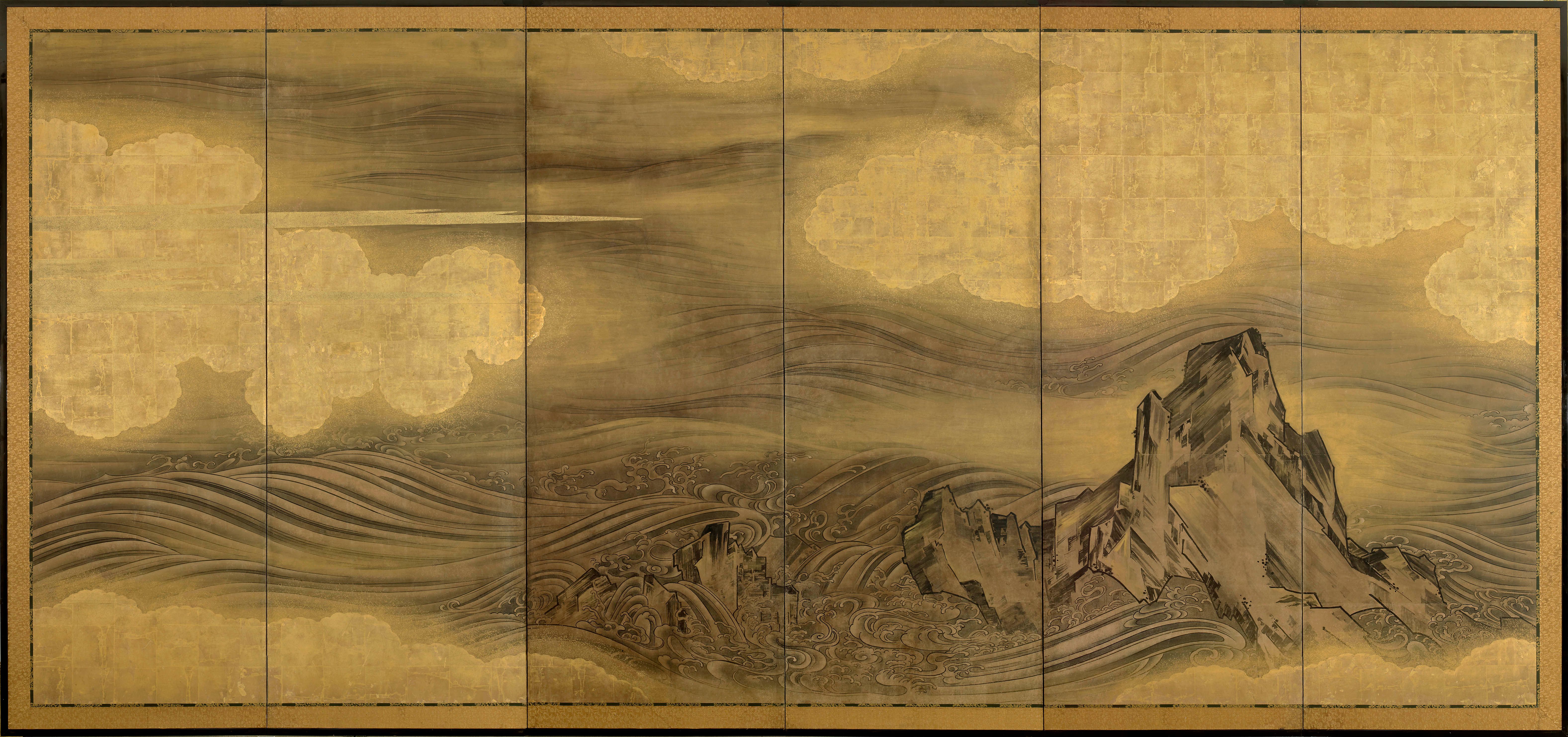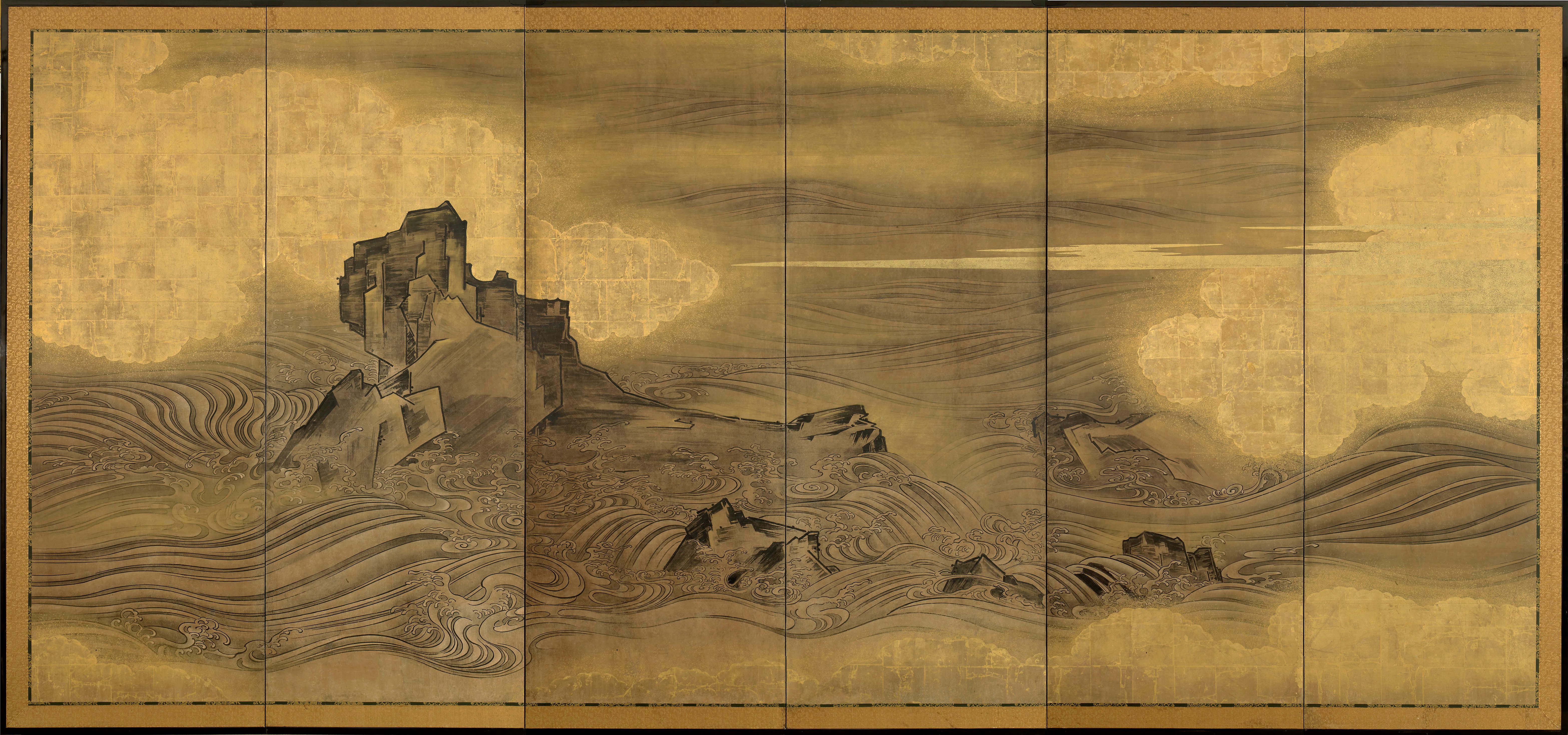 Paire de paravents à six volets peints à l'encre sur un fond chamois avec des rochers et des vagues parmi des nuages dorés.