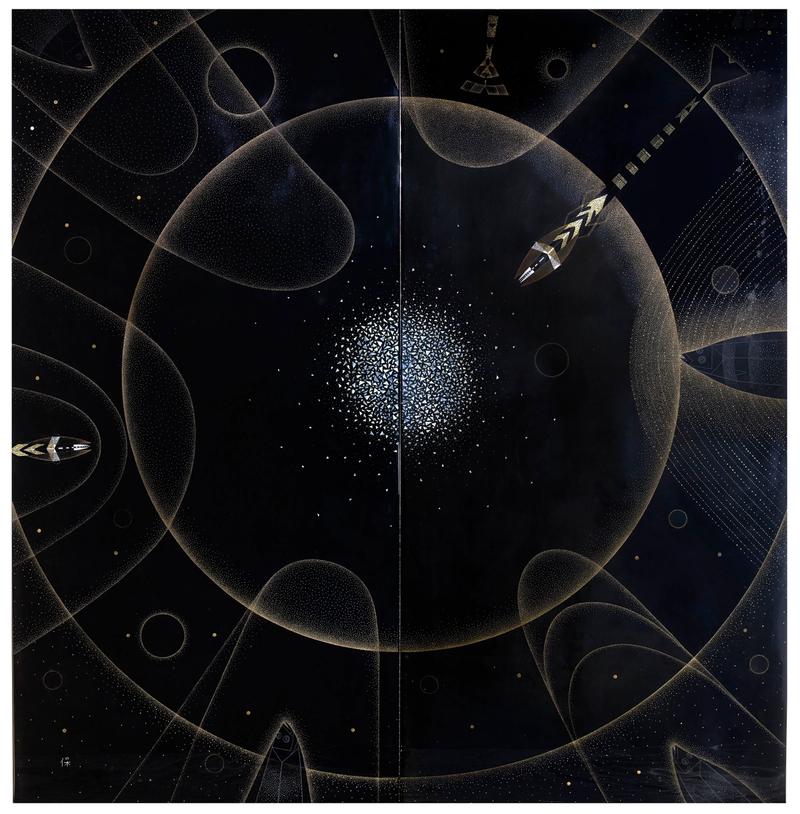 Paravent en laque à deux volets avec un motif abstrait de poissons dans l'abîme, réalisé en laque d'or et d'argent avec des détails incrustés en nacre sur un fond noir.