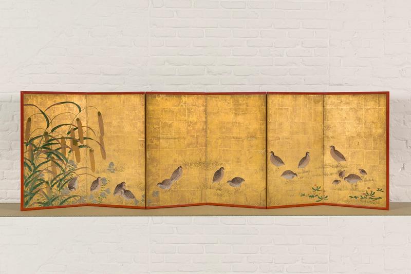 Écran de papier à six volets, peint à l'encre et en couleur sur fond d'or, représentant une volée d'uzura (cailles) et des poussins parmi du kibi (millet), des herbes, du nokongiku (aster) et du tampopo (pissenlit).