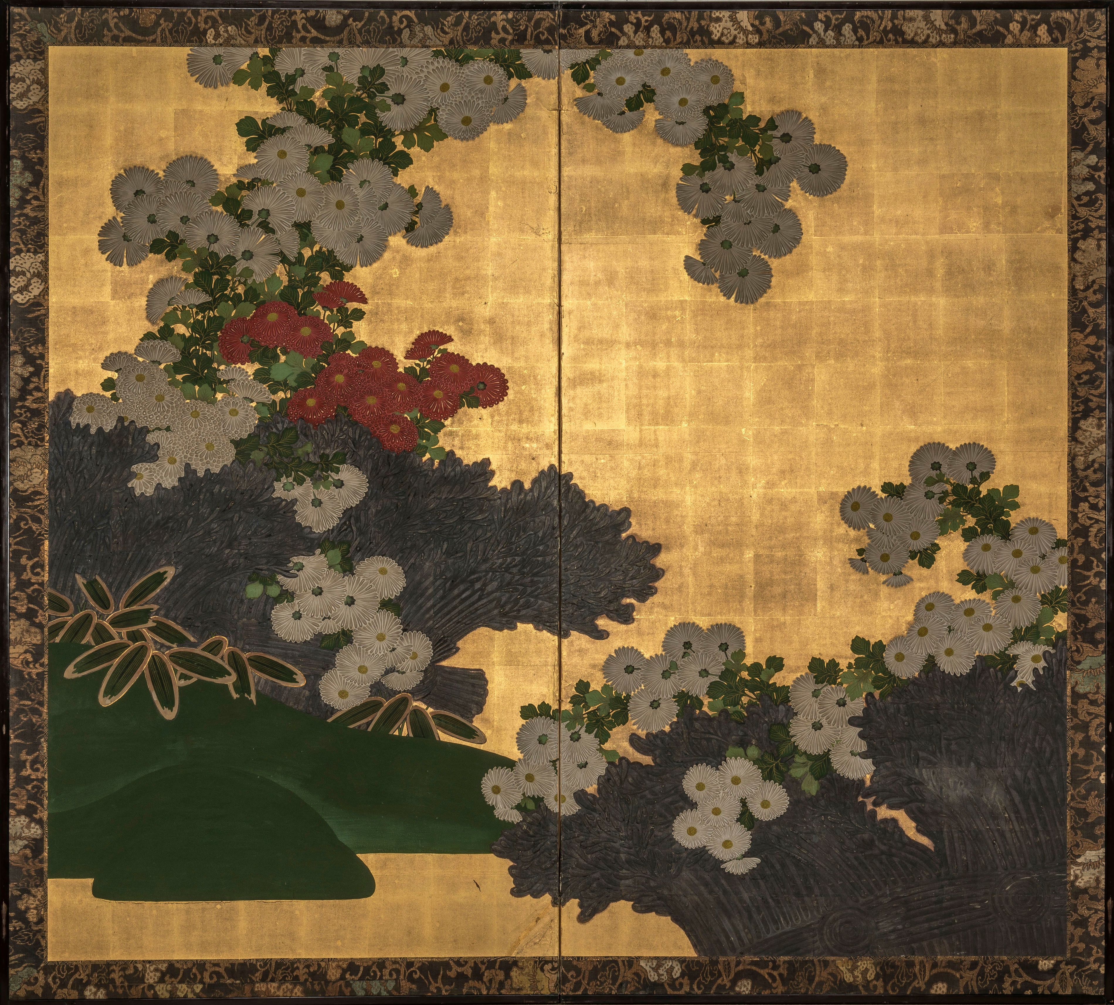 Un double écran de papier peint à l'encre et à la couleur sur fond d'or avec des chrysanthèmes rouges et blancs derrière une clôture de broussailles, tous deux rendus en moriage (motif en relief).