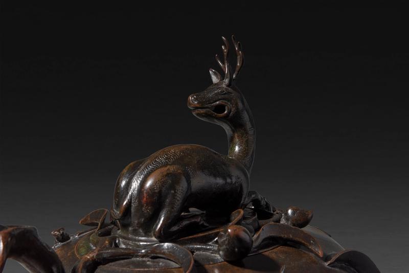 A bronze censer in the form of a peach with bats in flight, the cover formed as a recumbent stag.