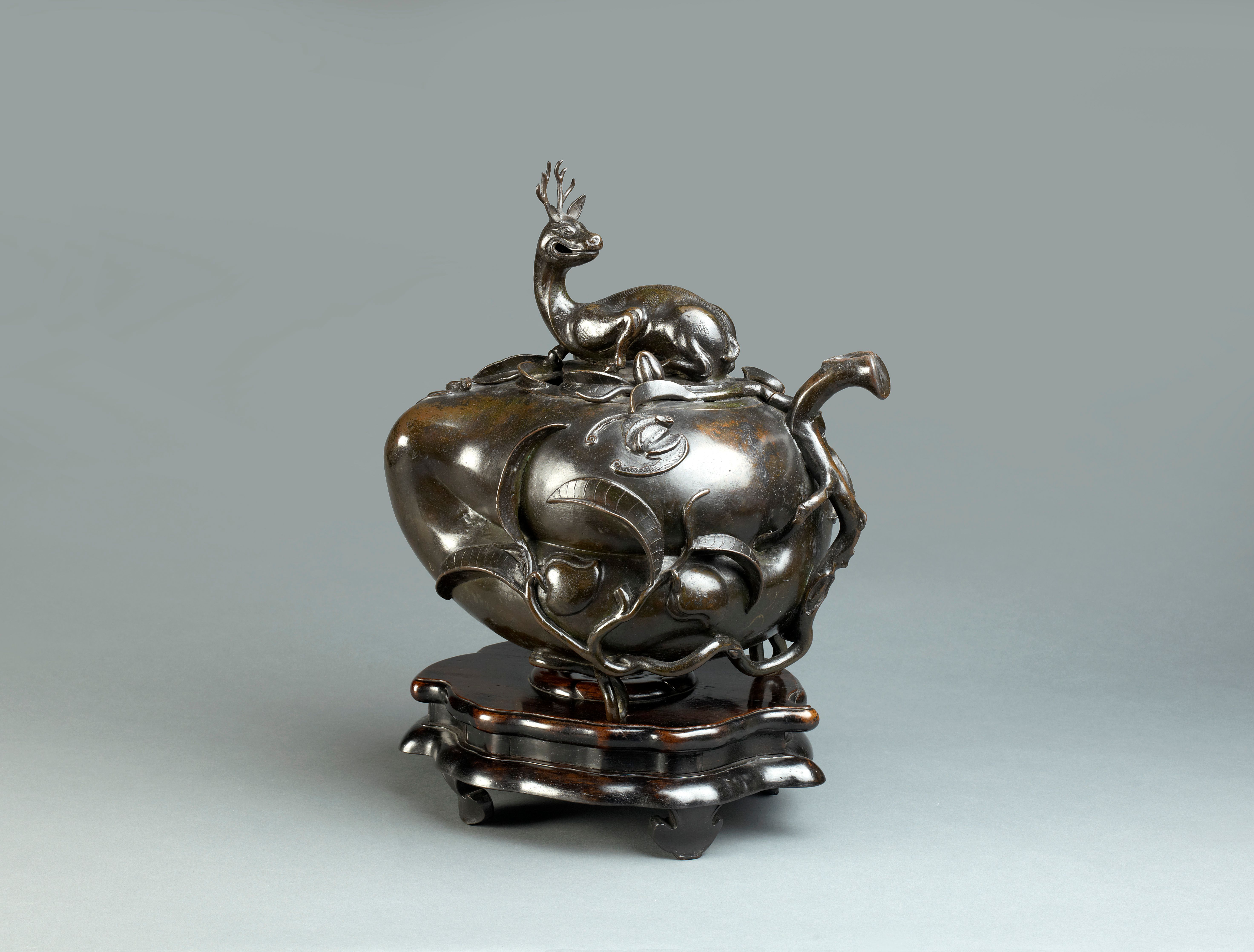 The three universal energies, Fu (happiness), Lu (wealth) and Shou (longevity) are combined in this censer. Fu (bat) is emblematic of happiness and longevity, Lu (deer) is believed by the Chinese to live to a very great age, and has therefore become an emblem of long life. It is said to be the only animal which is able to find the sacred fungus of immortality. Shou Lao, the God of Longevity is often depicted either riding on a deer or leaning on it. Shou (peach) has an important place in Chinese superstitions and appeals highly to the aesthetic sense of the people. It is an emblem of marriage and the symbol of immortality and springtime. Shou Lao is also often depicted as issuing from a peach.
