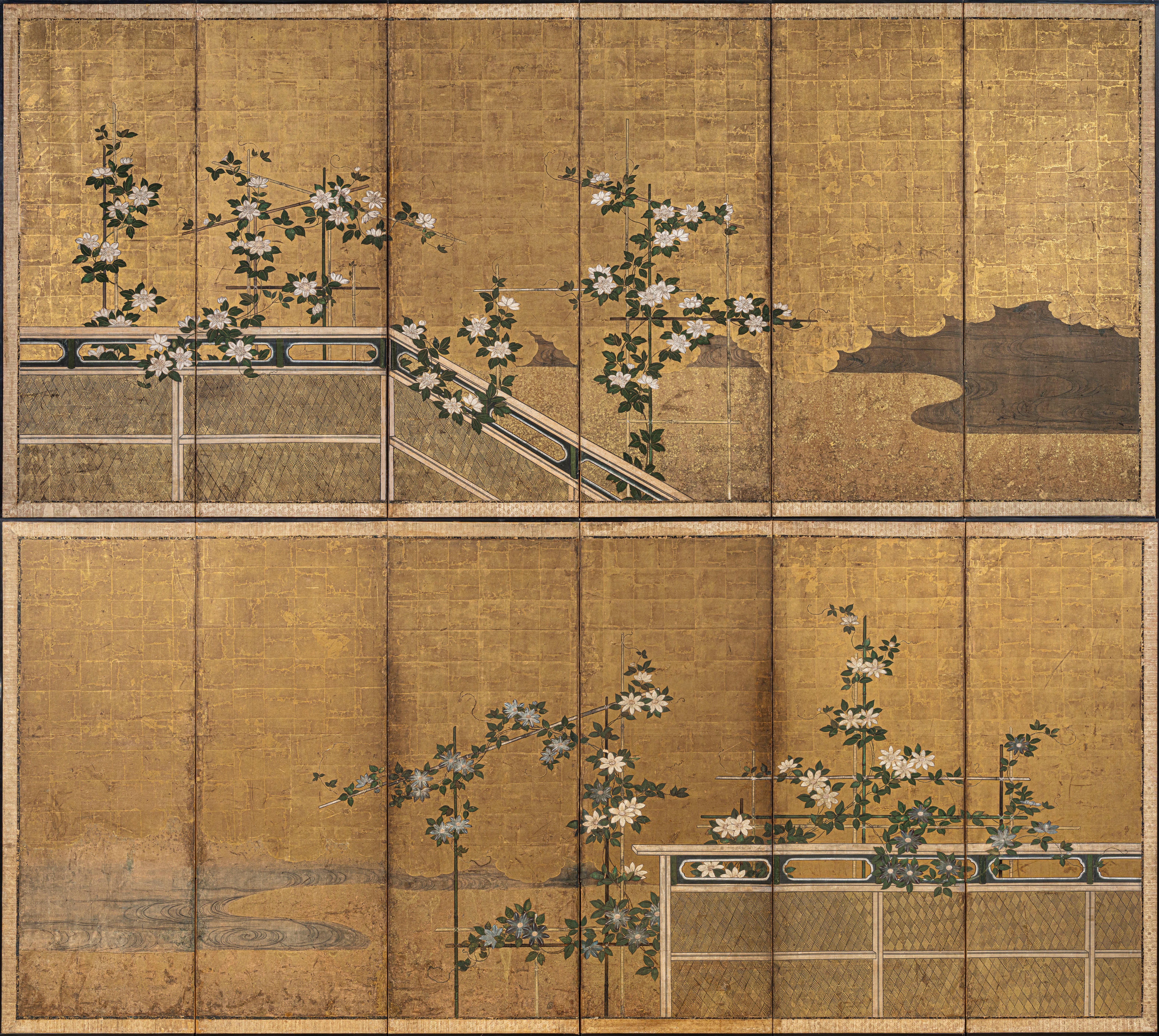 A four-fold screen; aluminum flake pigment in polyvinyl acetate medium, yellow alkyd varnish, on paper with three characters reading: ryū shiru ryū (dragon knows dragon), an expression meaning “to recognise greatness in greatness”.
