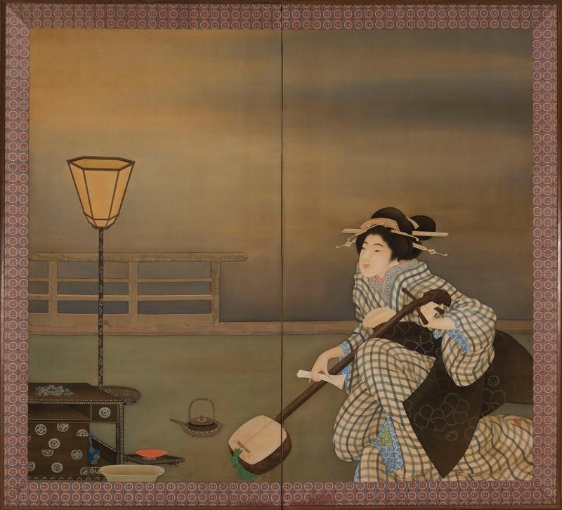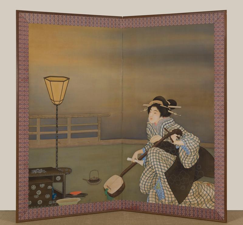 A two-fold silk on paper screen painted in ink and colour with a Geisha tuning her shamisen on the balustraded veranda of a tea house.
