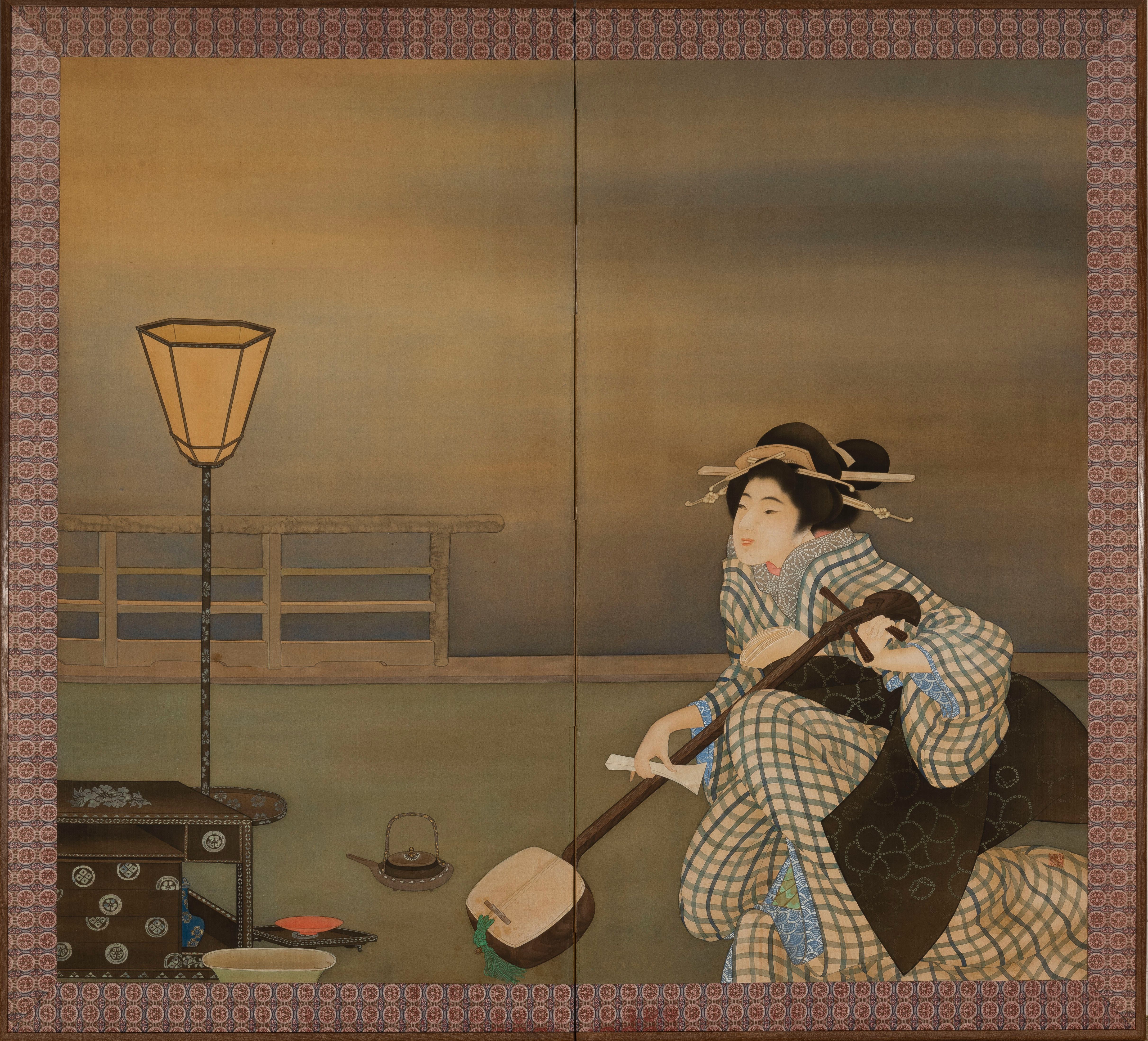 A two-fold silk on paper screen painted in ink and colour with a Geisha tuning her shamisen on the balustraded veranda of a tea house.
