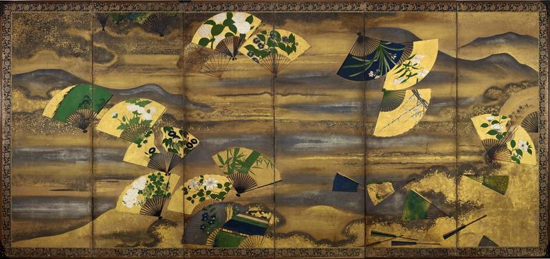 A pair of six-fold semmen nagashi-zu byōbu (screens with fans over flowing water) painted in ink and colour on a gold and silver ground with scattered fans over a mountainous coastal landscape. The clouds and mist are rendered in both gold and silver sunago (gold/silver dust), and the detail of the motifs on several of the fans, as well as the rivet of each fan, is executed in moriage (raised design).