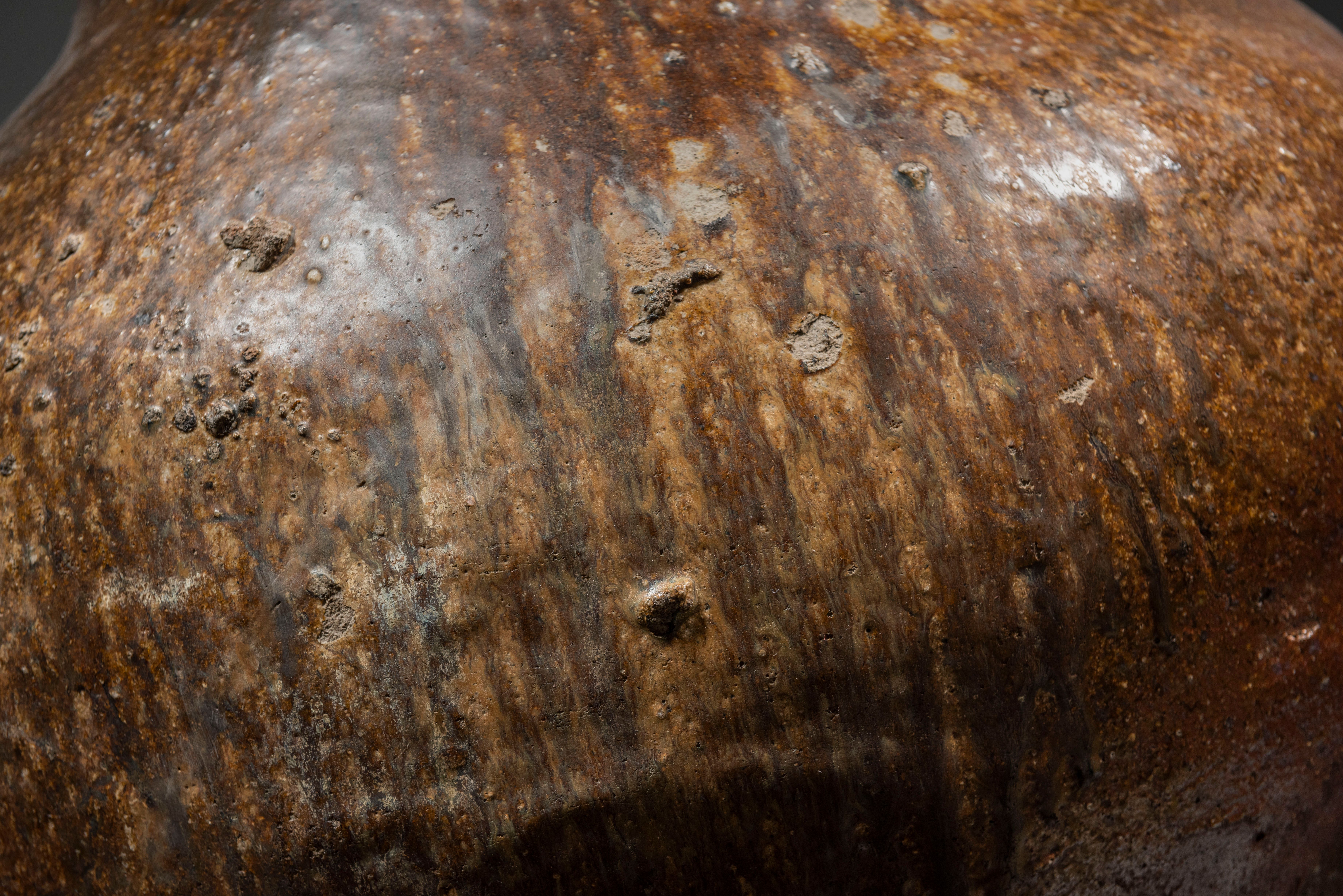Tokoname jars were made by piling coils of clay, smoothing the interior and exterior surfaces, and allowing the clay to dry before adding another section. The wide rim and mouth were then formed on a potter's wheel and added to the top of the jar. The small base allowed the vessel to stand safely on a narrow step on the steep slope of a rising kiln floor; such kilns were built into the side of a hill and used wood for firing. The natural ash glazes took about a week to ten days to form and created unevenly coloured and randomly glazed surfaces often spotted with particles of fired earth that dropped from the kiln ceiling. Tokoname, which focused on agricultural storage vessels, was the largest centre of ceramic production in medieval Japan.