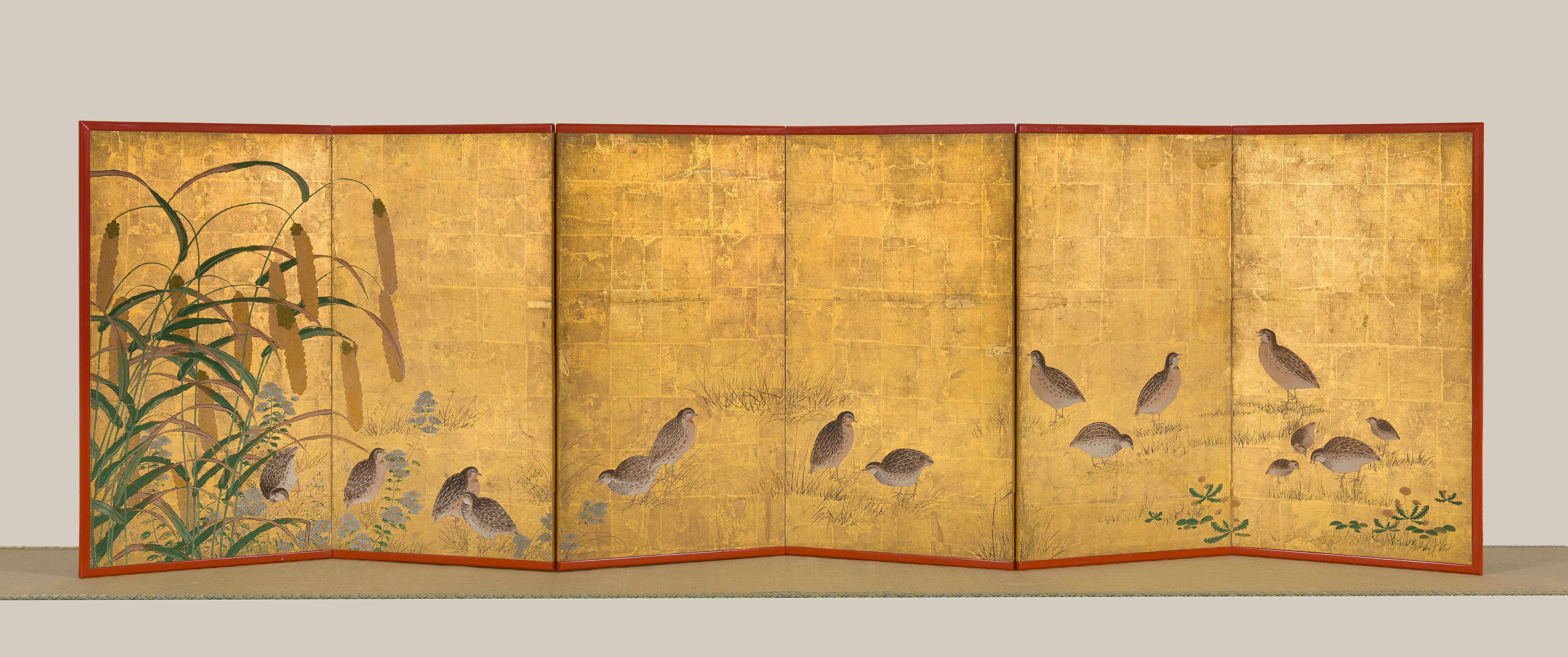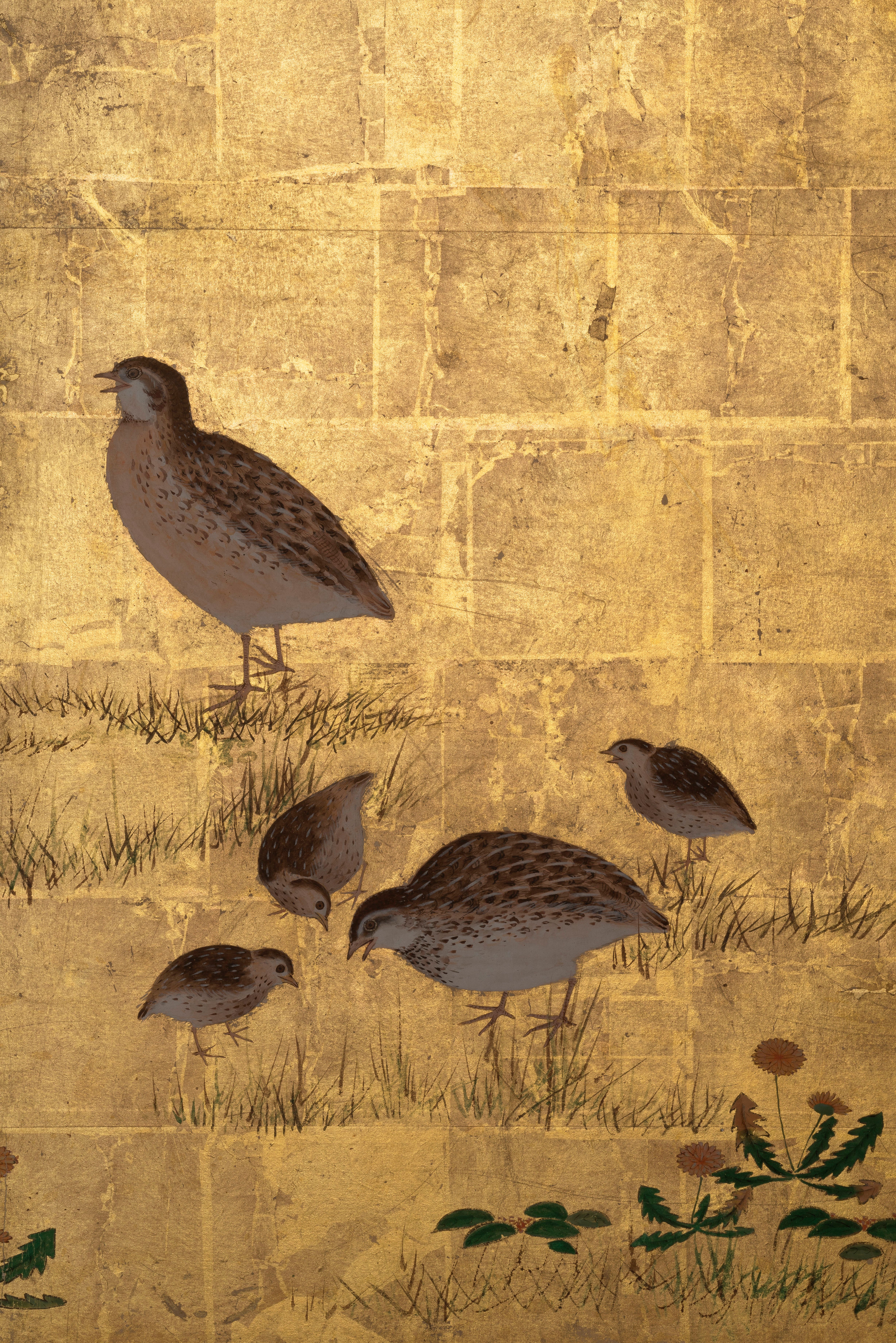 A six-fold paper screen painted in ink and colour on a gold ground with a covey of uzura (quails) and chicks amongst kibi (millet), grasses, nokongiku (aster) and tampopo (dandelion).