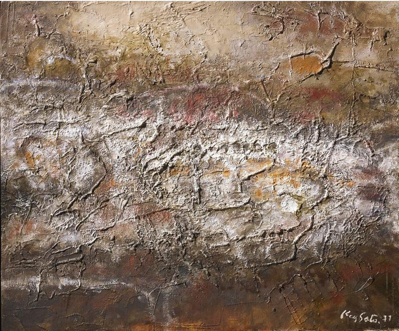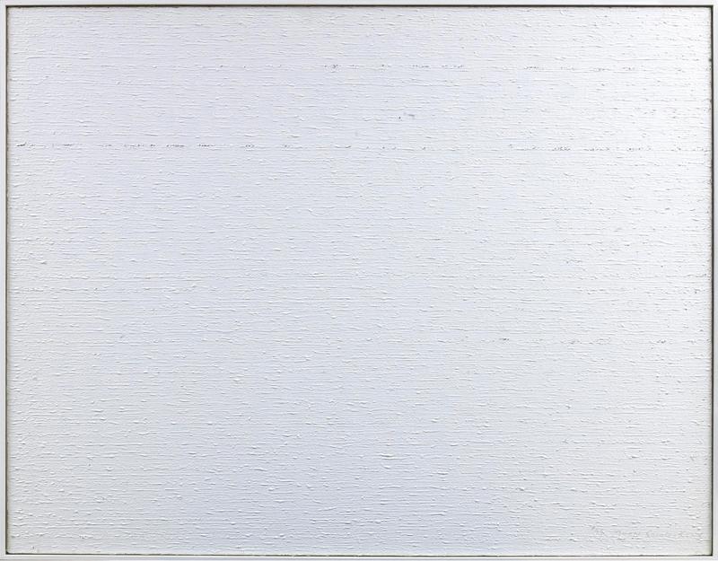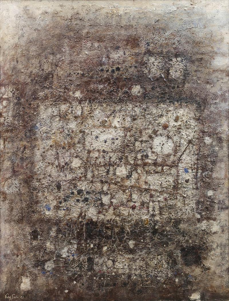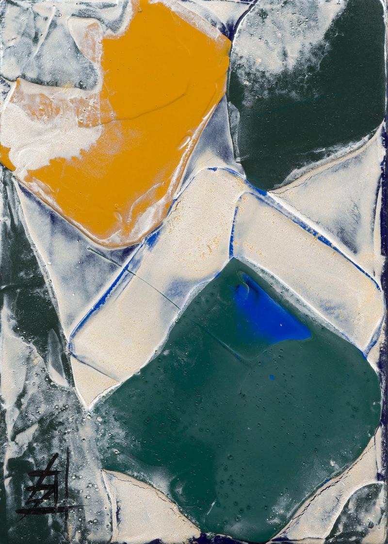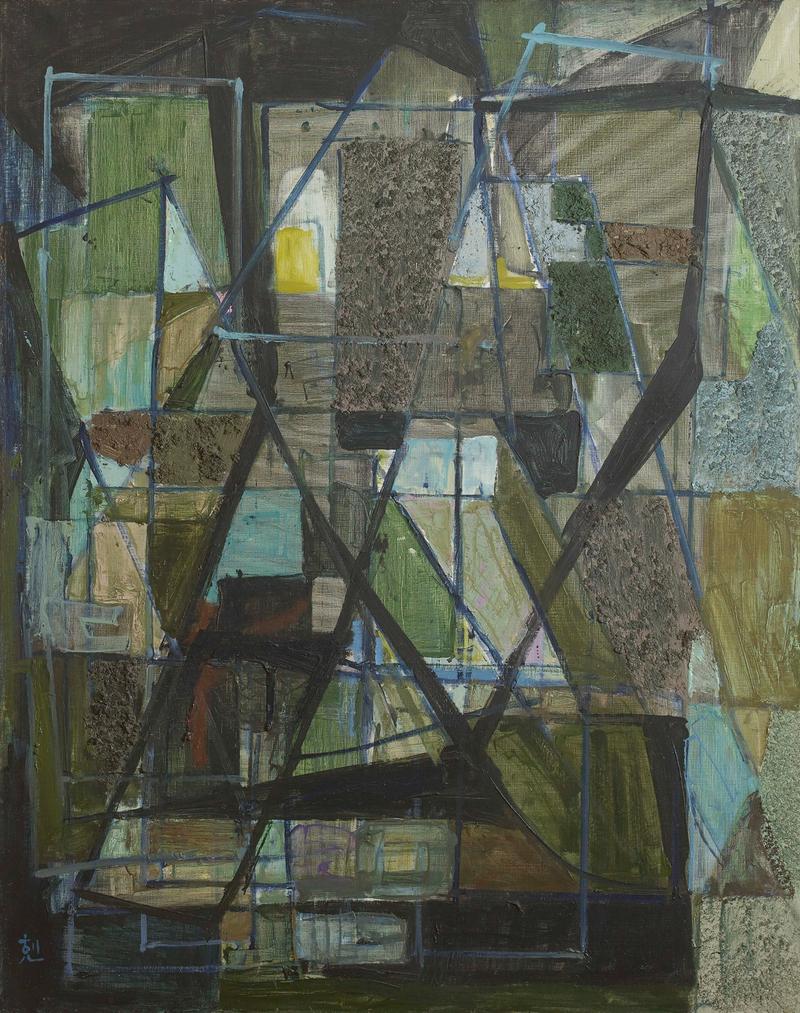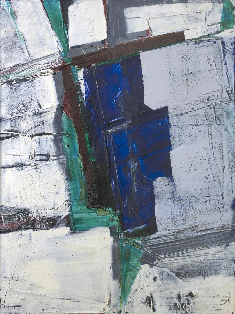 In the early stages of his career, Yamada focused on still life paintings, influenced by his experiences of three air raids in Tokyo and the following post-war bleakness. The ‘Still Life’ series features objects such as bottles, vessels and fruits, reimagined from his memories and gradually deconstructed. In 1953, Yamada studied under the abstractionist Hasegawa Saburo (1906-1957), which marked a pivotal shift towards abstraction in his work, leading to the inception of the ‘Work’ series in 1956.