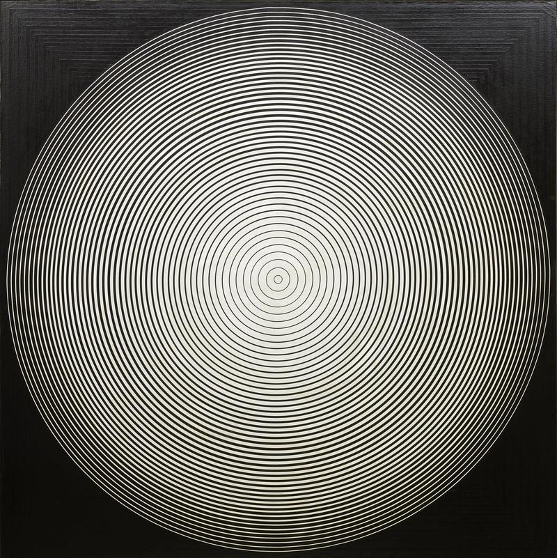 The ‘Work’ series, spanning almost 40 years until 1995, is characterised by geometric patterns such as stripes, crosses and grids. The recurring stripe motif illustrates Yamada's theories of ‘all colours’, ‘colour equality’ and ‘totality’, which are the concepts detailed in his extensive production notebooks spanning 2,000 pages. Initially multicoloured, the stripes evolved to a more restrained palette of two or three colours by around 1965.