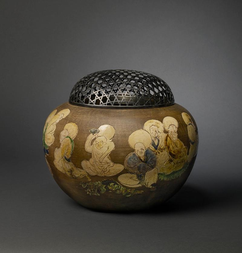 The body is decorated with seventeen Rakan (saintly ascetics) incised and painted in coloured enamels. All are seated wearing loosely fitting robes, a halo surrounds each of their shaved heads and some hold alms bowls whilst a few rest on straw mats.