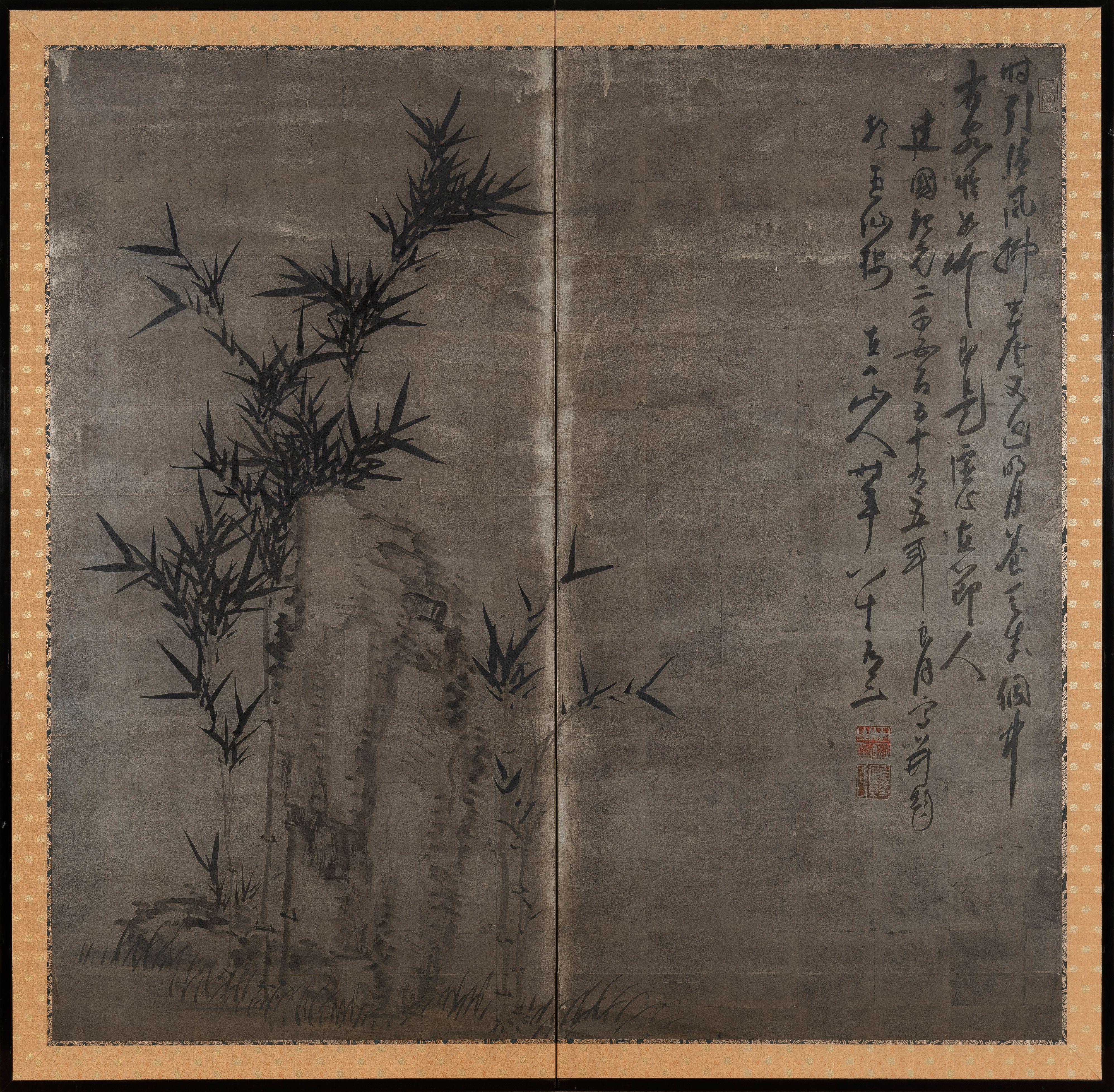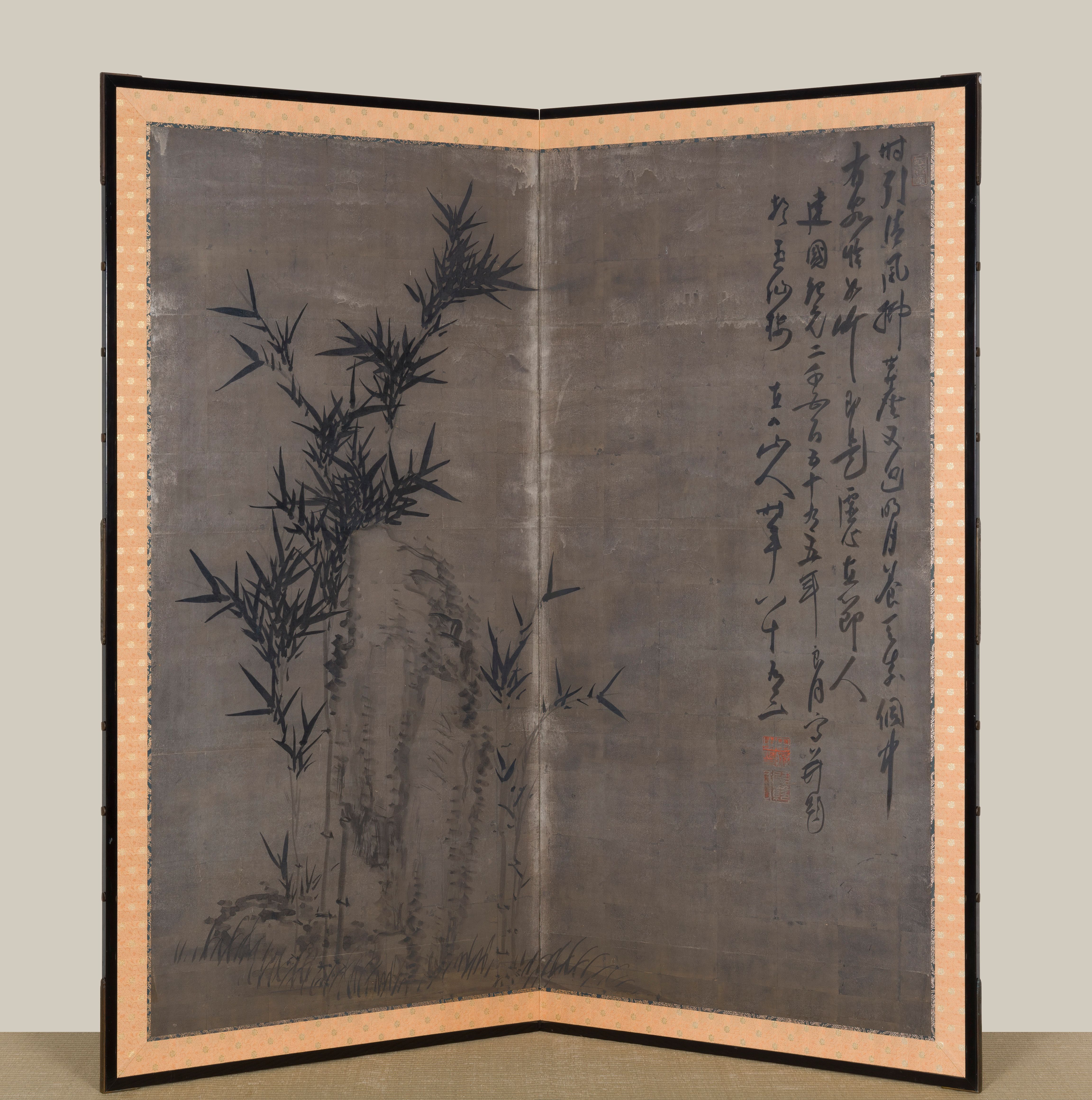 A two-fold paper screen painted in ink on a silver ground with a rock, bamboo and calligraphy.