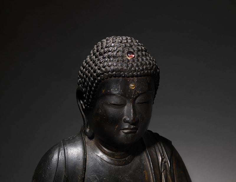 A lacquer and gilt wood figure of a seated Amida Nyorai (Amitābha) dressed in a flowing robe