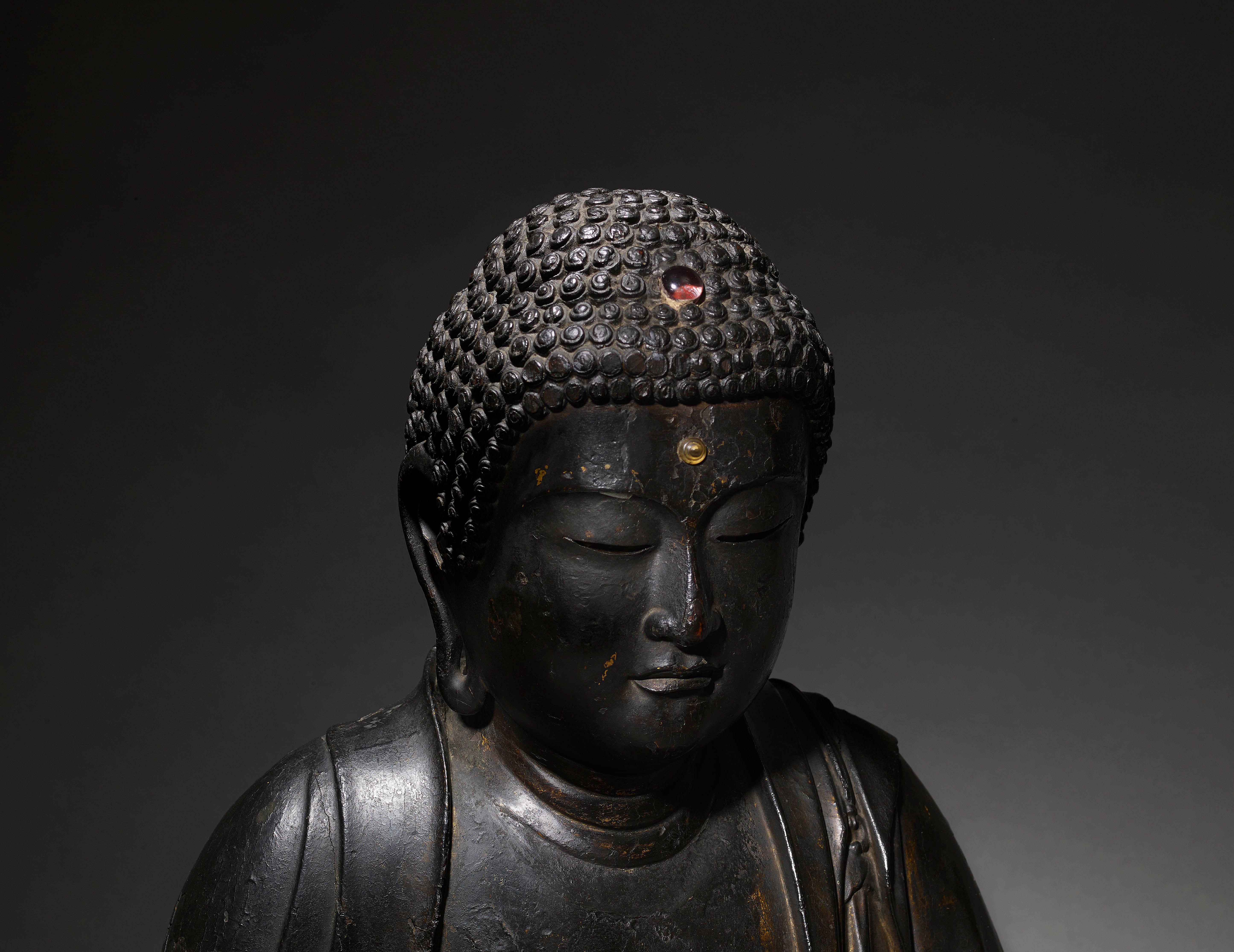 A gilt-wood figure of Amida Buddha seated in kekka fuza (lotus position) the hands in jō-in (meditation mudra). The head is adorned with crystals representing the byakugō (white spiralling hair) on the forehead and the nikkei-shu (red jewel on the protrusion on top of the Buddha's head).