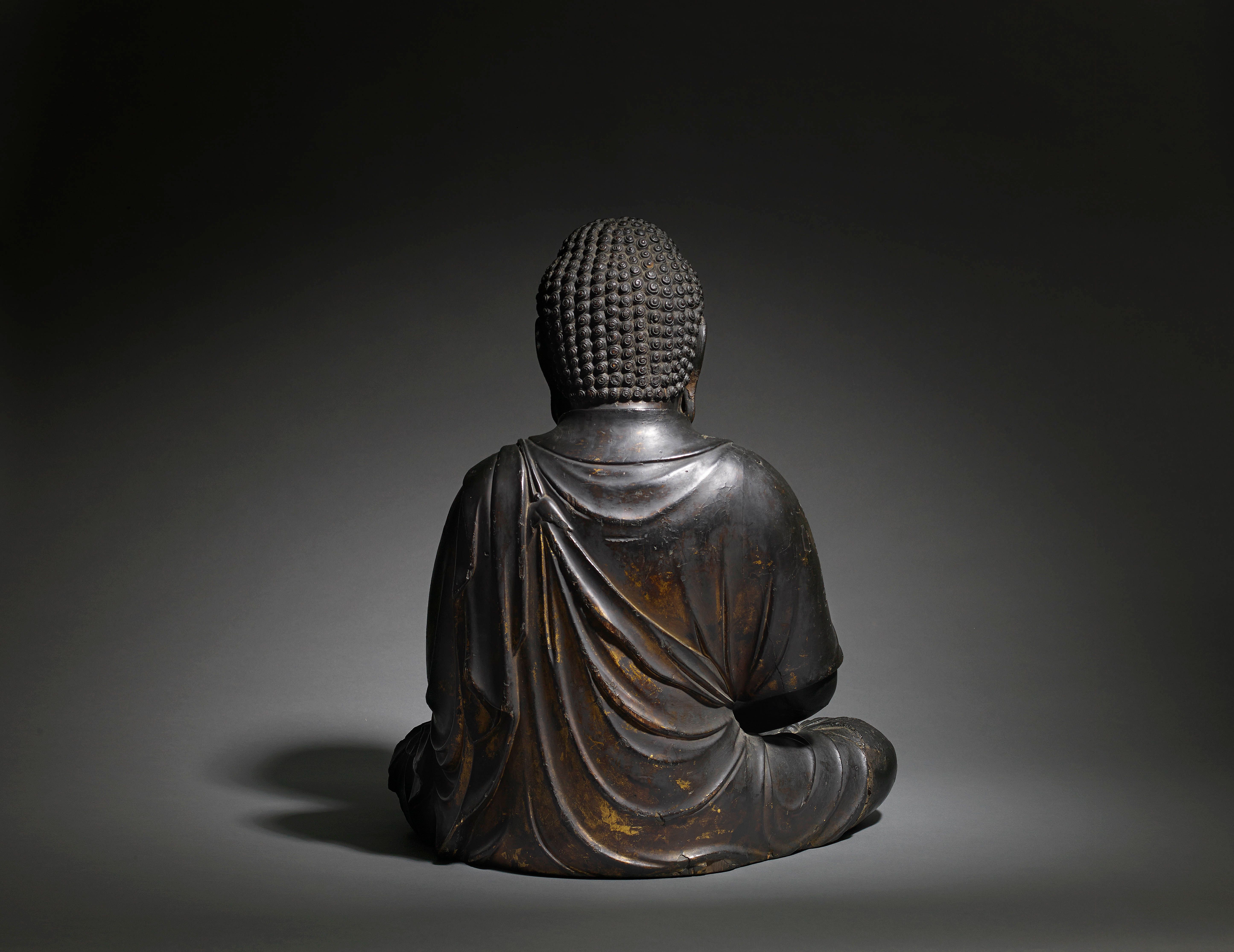 A lacquer and gilt wood figure of a seated Amida Nyorai (Amitābha) dressed in a flowing robe
