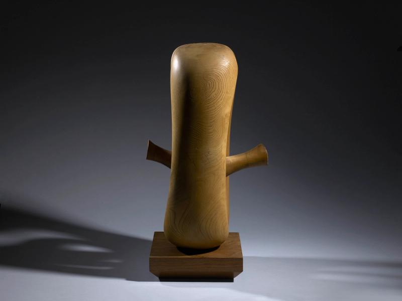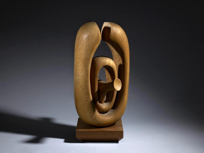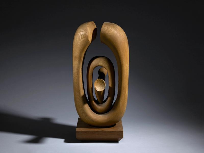 A wood sculpture of interweaved oval shapes.