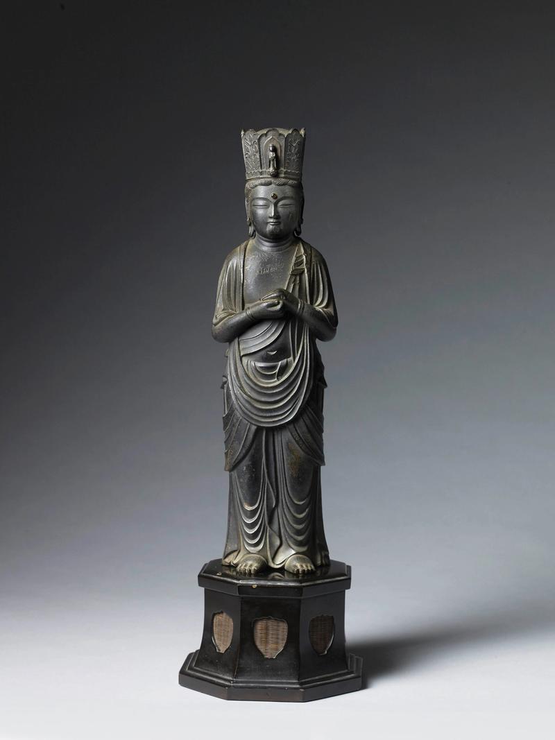 A gilt bronze figure of Kannon Bosatsu (Bodhisattva) in the Zenkoji-style.