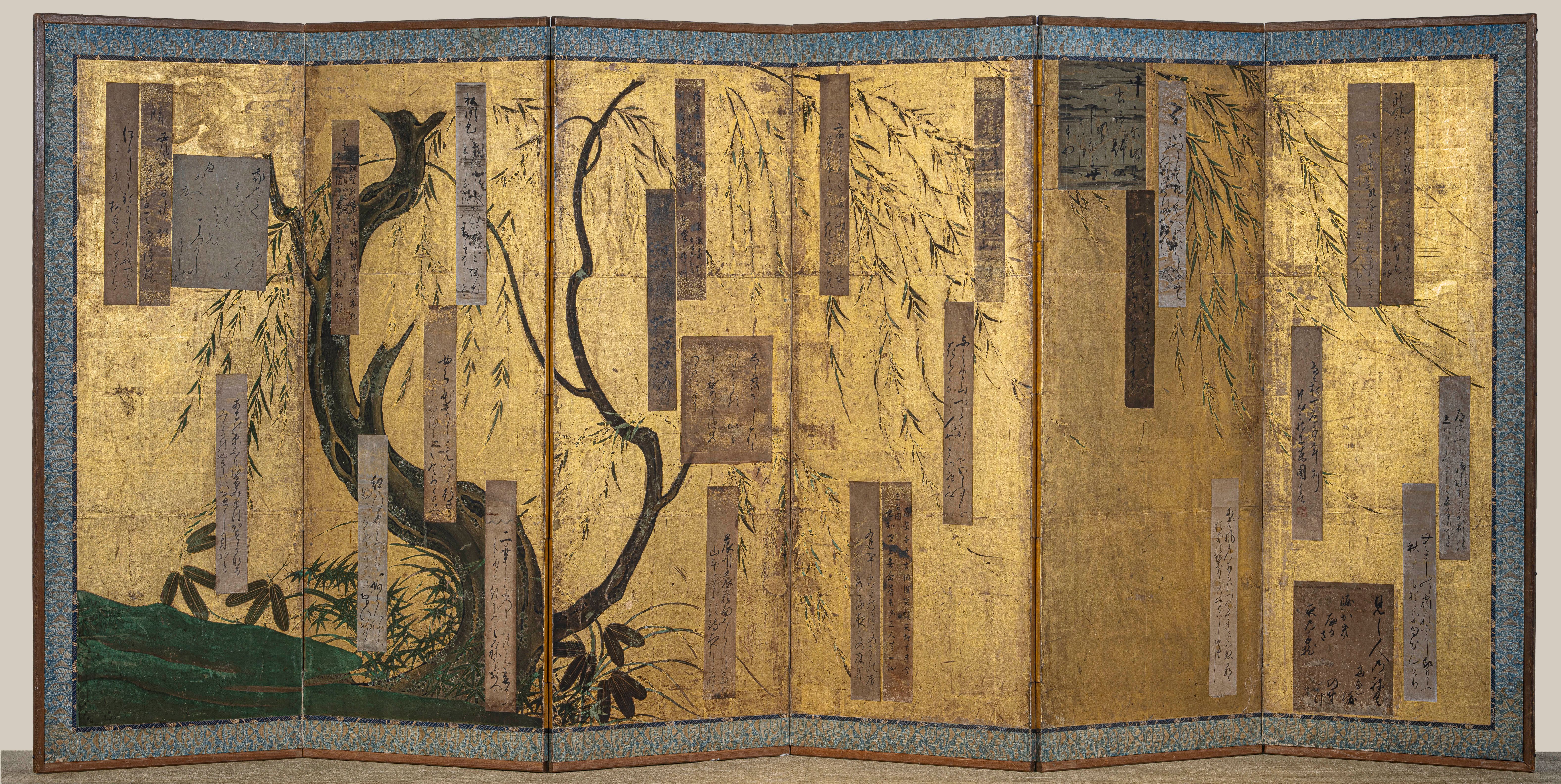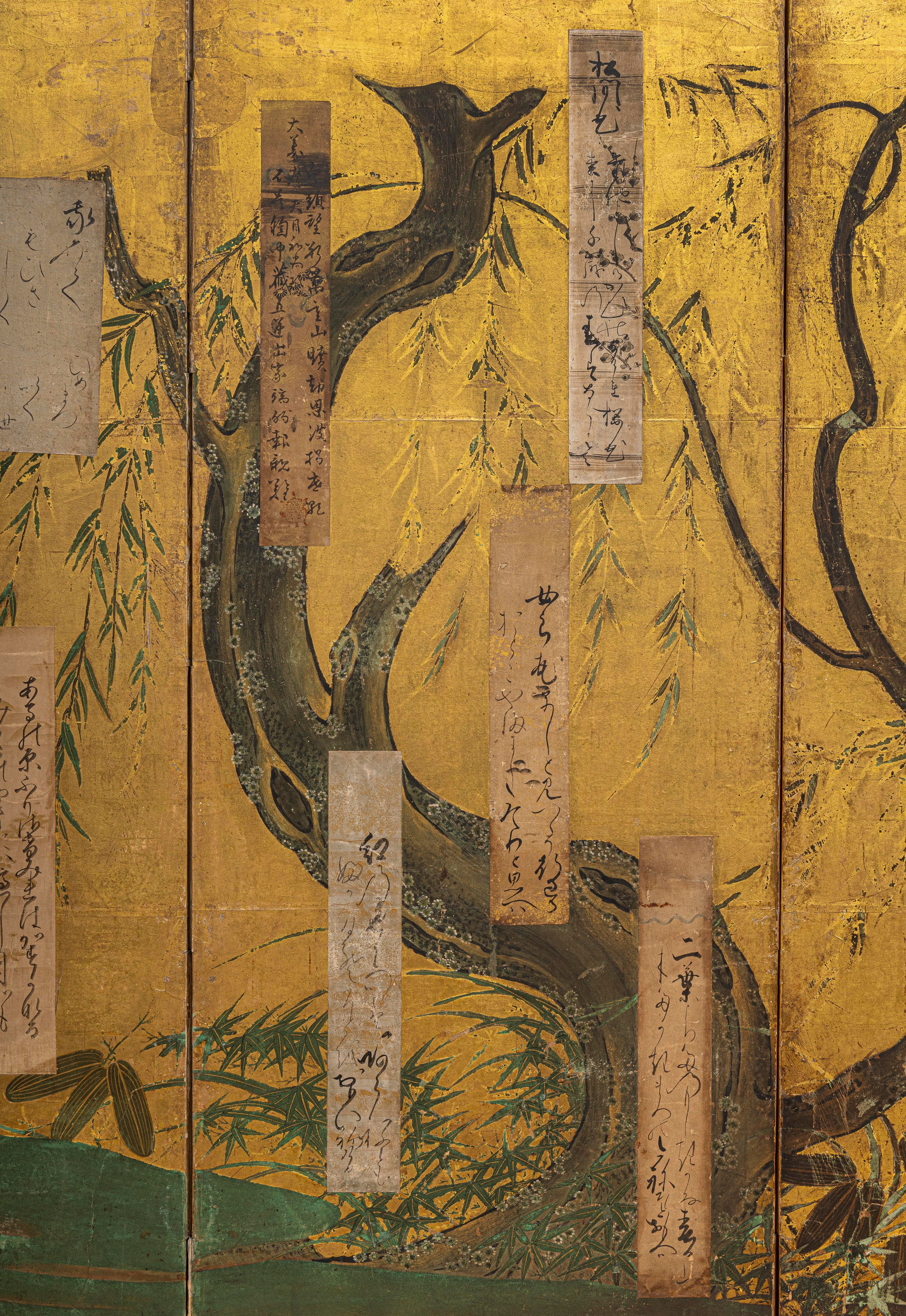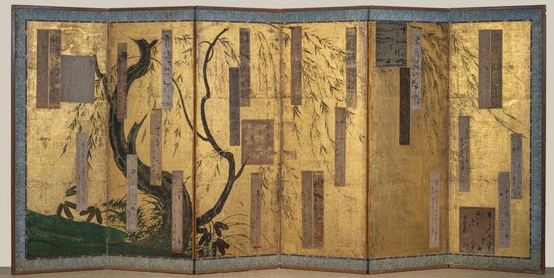 A six-fold paper screen painted in ink andcolour on a gold leaf ground depicting a willow tree with various shikishi and tanzaku (poem slips).