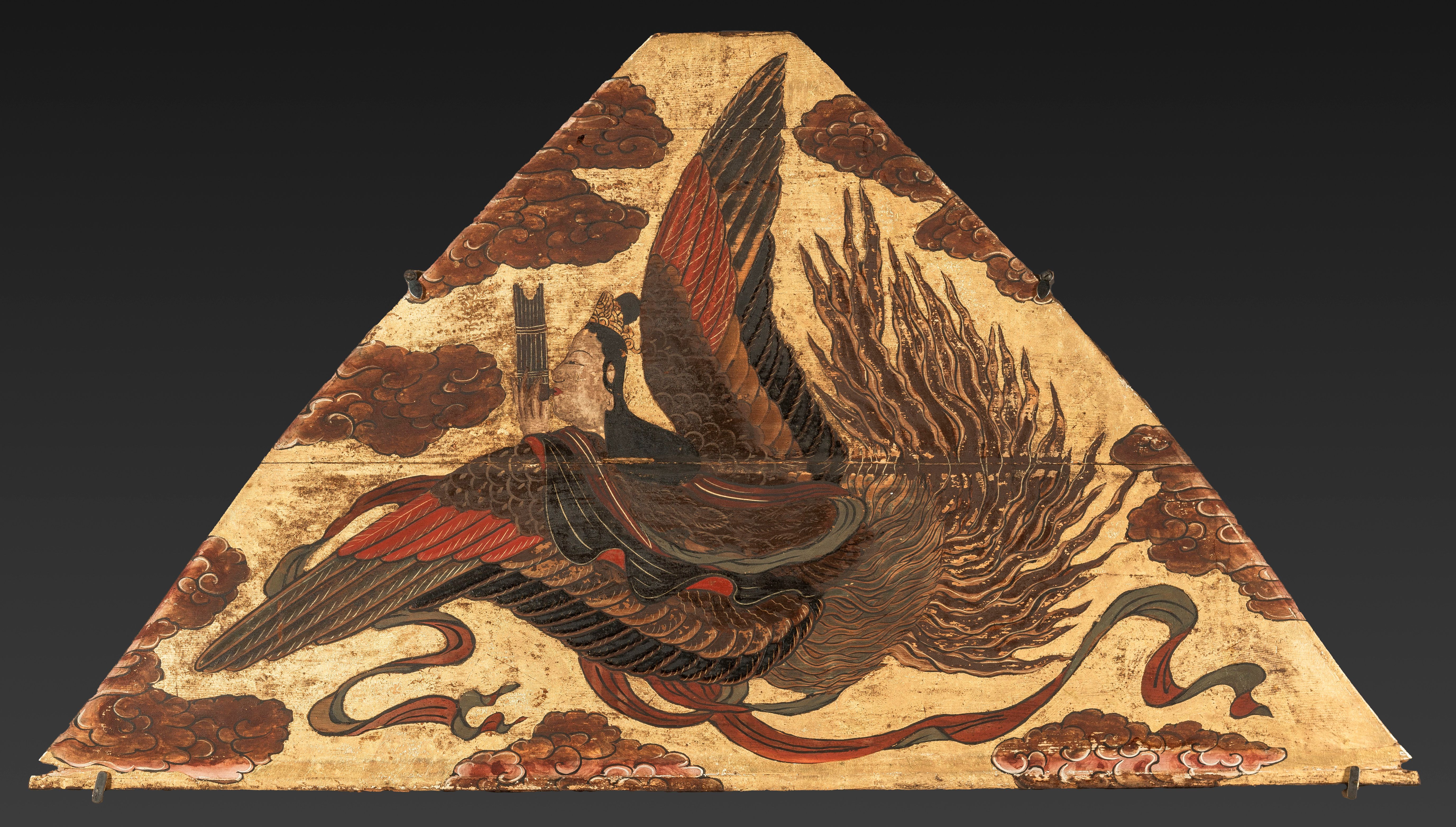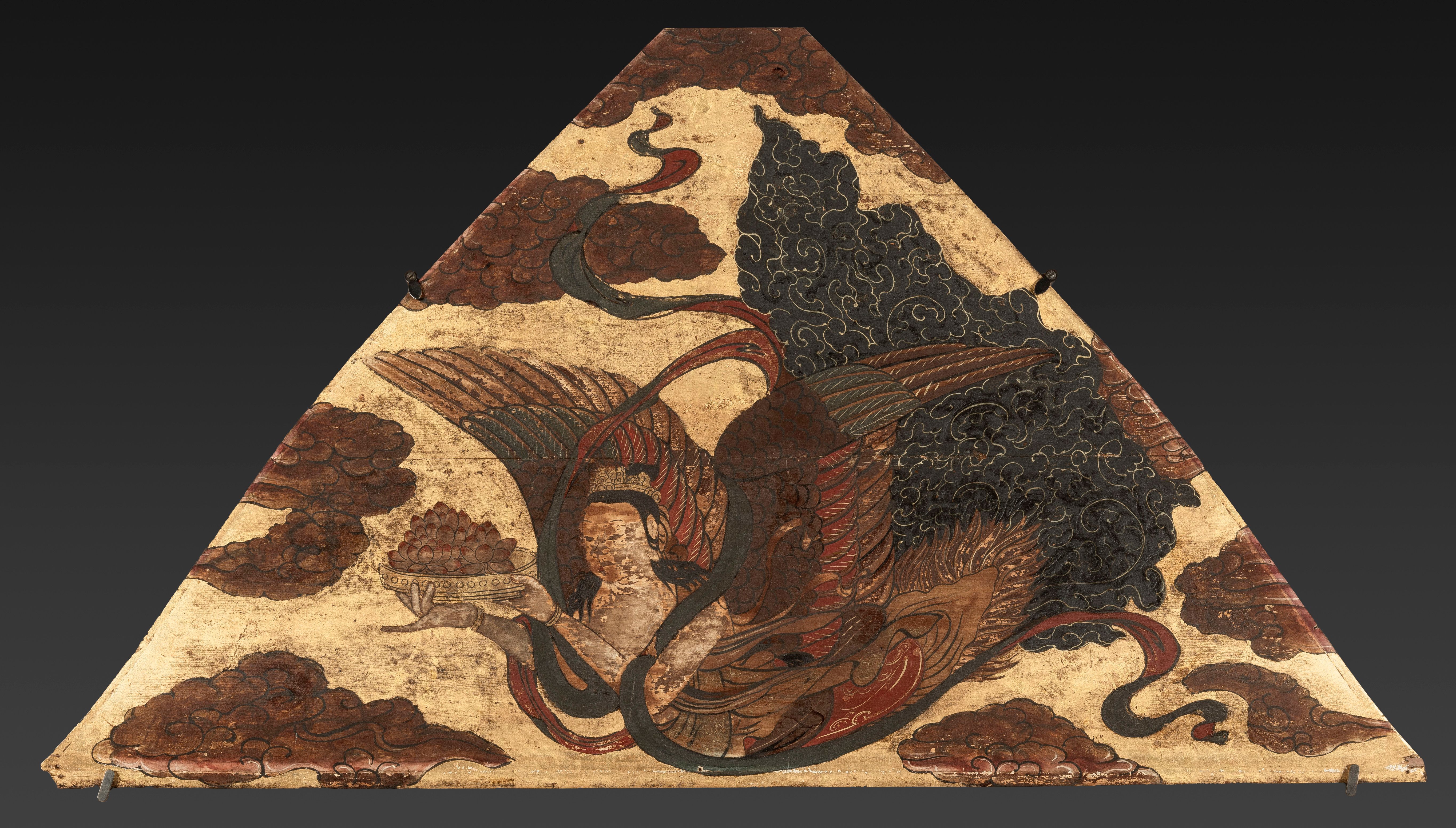 Comparable depiction of tennyo can be found on the canopy of Toji temple, Kyoto, (9th century, Heian period, National Treasure). See Tokyo National Museum ed., National Treasures of To-ji Temple: Kukai and the Sculpture Mandala, (exhibition catalogue, 2019), p. 118, no. 57.).