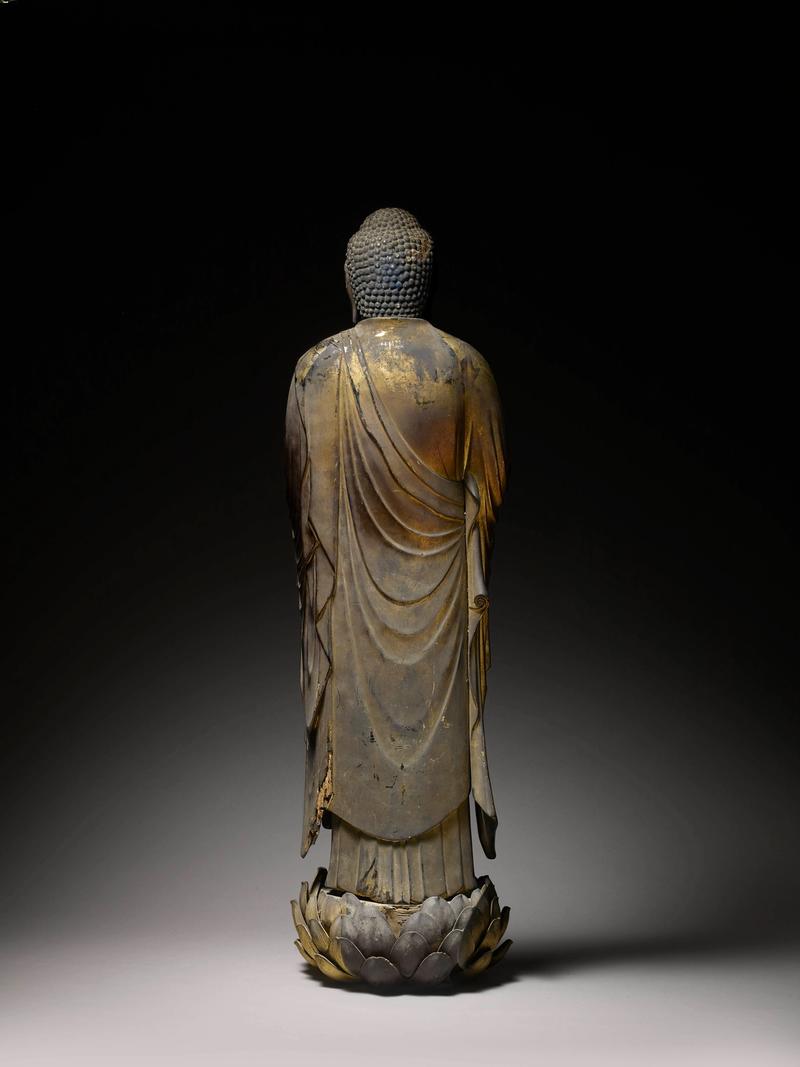 For comparable examples of Amida Nyorai standing on a double lotus base see: Tokyo National Museum ed., Tokubetsuten Kamakura-jidai no Chōkoku [Special Exhibition: Japanese Sculpture of the Kamakura Period], exhibition catalogue, (Tokyo, 1975), no. 61 (dated 1259, by Eisen, Tokyo National Museum, Important Cultural Property);Nara National Museum ed., The Buddhist Master Sculptor Kaikei: Timeless Beauty from the Kamakura Period, (Nara, 2017), no. 62 (attributed to Gyokai, 1212, Jodo-school, Kyoto, Important Cultural Property);Asia Society Museum ed., Kamakura, Realism and Spirituality in the Sculpture of Japan, (New Heaven and London, 2016), p.102, no. 25 (mid-late 13th century, Asia Society, New York: Mr and Mrs John D. Rockefeller 3rd Collection).