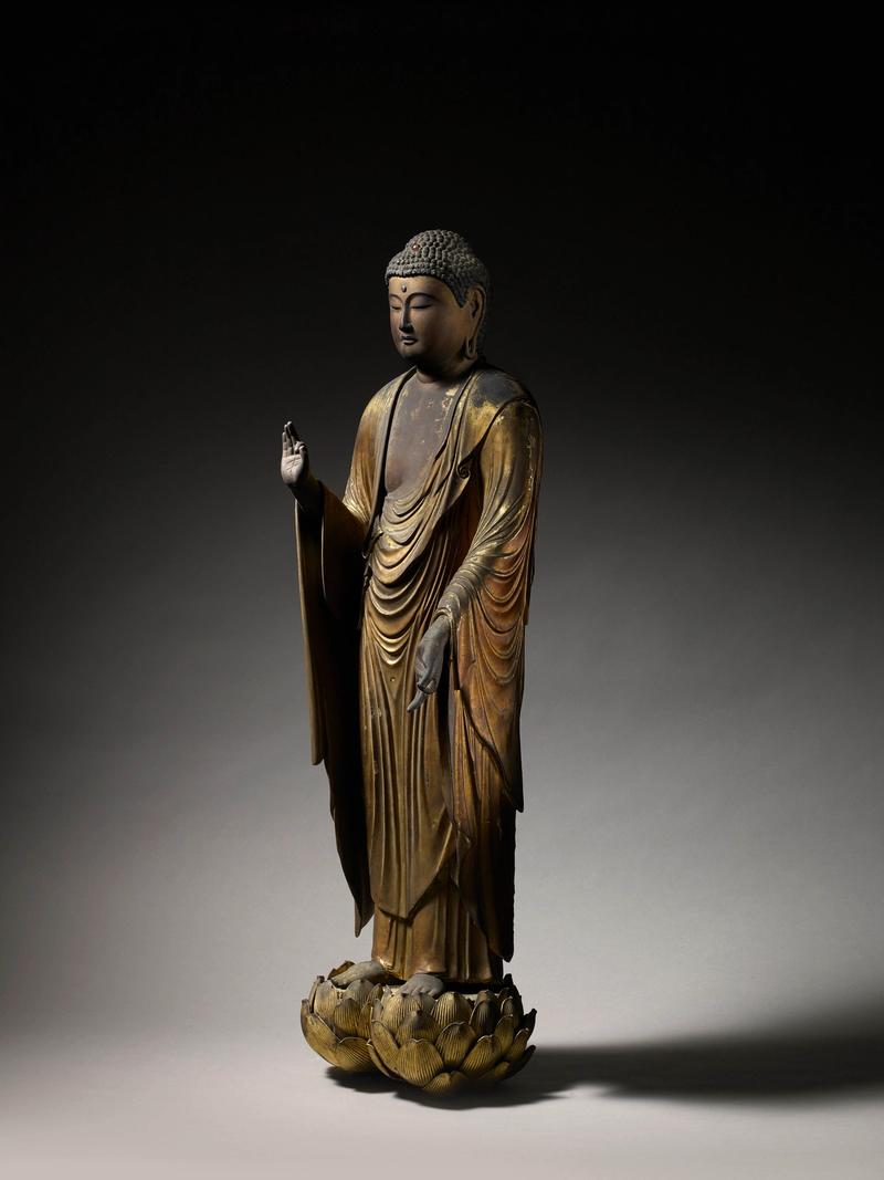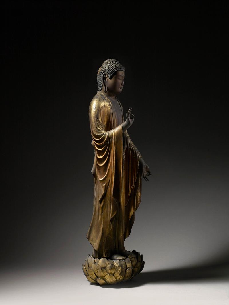 This particular style of Amida Nyorai sculpture is called Annamiyō (Annami-style), a name which is derived from An-amidabutsu, a Buddhist title given to Kaikei (act. c. 1183-1223). Often compared with another Kei-School great master Unkei (d. 1224), Kaikei was one of the most important Buddhist sculptors in Japanese art history, active in the late-Heian to Kamakura periods. Kaikei's works are generally known to be graceful, while keeping the reality of the figure. With the rise of the Jōdo (Pure Land) Buddhism sect, Kaikei, as a devout believer, produced a number of San-jaku Amida (standing Amida figures of approx. 80cm to 1m high) with raigōin, a mudra welcoming believers into the Great Western Paradise, throughout his career. Their beautifully proportioned faces are gentle and intellectual, bodies are moderately fleshy and the pictorial robes drape delicately. In his later works, the drapery becomes more complicated, making the figures even more graceful. Widely favoured as the ideal embodiment of Amida Nyorai in Japan, Kaikei’s style was carried on and developed by his followers and later generations. Most standing Amida figures produced during and after the time of Kaikei are said to be more or less influenced by his style.