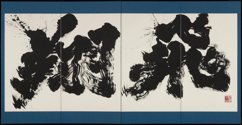 This unusual screen bears the key words that epitomise Suda Kokuta’s life and philosophy. The large, powerful calligraphic character “Kyo” in the centre means “emptiness” or “void”, a significant idea in Zen Buddhism that continuously influenced the artist throughout his life.