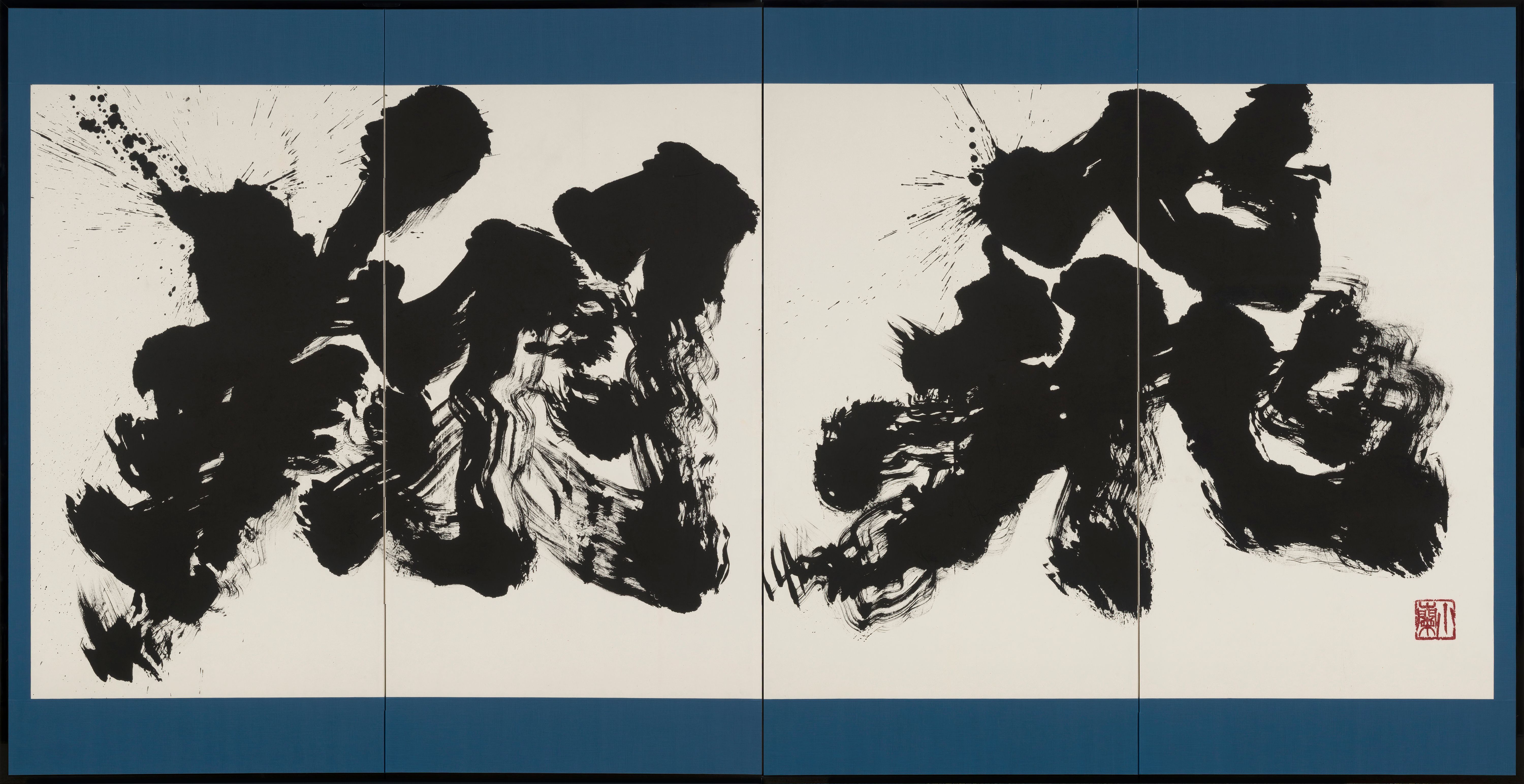 This unusual screen bears the key words that epitomise Suda Kokuta’s life and philosophy. The large, powerful calligraphic character “Kyo” in the centre means “emptiness” or “void”, a significant idea in Zen Buddhism that continuously influenced the artist throughout his life.