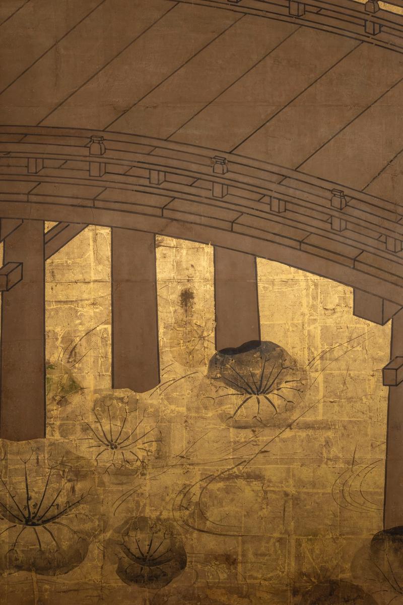 A two-fold paper screen painted in ink and colour on a gold ground with the Uji River and lotus beneath its renowned bridge.