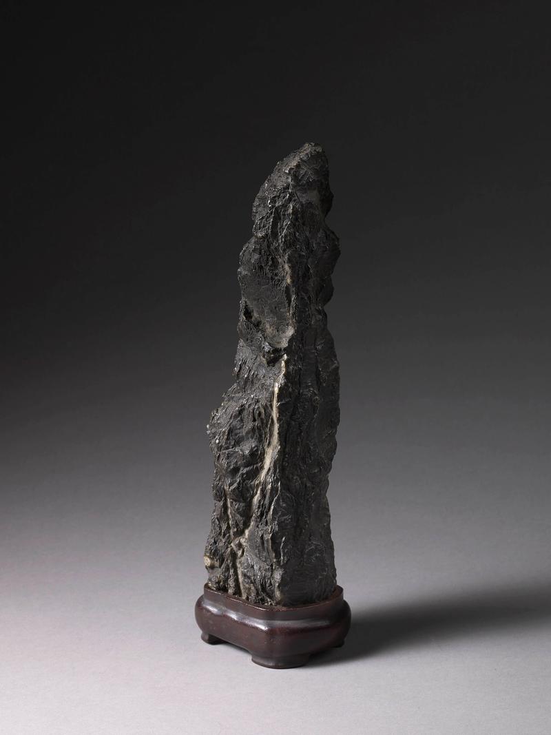 A suiseki (viewing stone) of vertical form with a natural striation resembling a waterfall, with wood stand