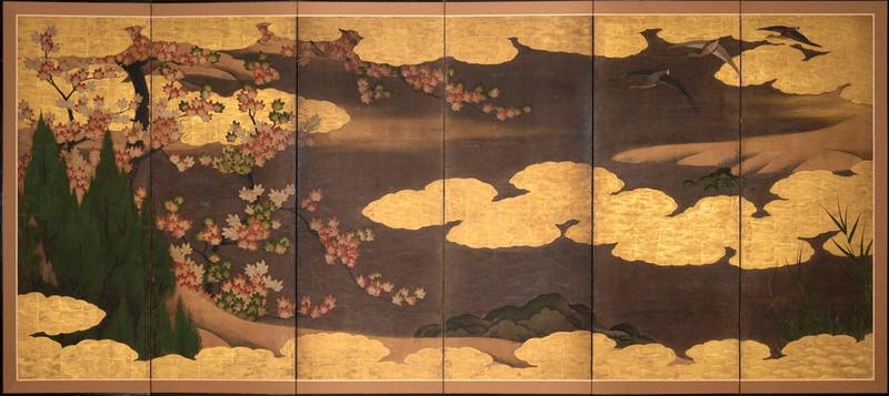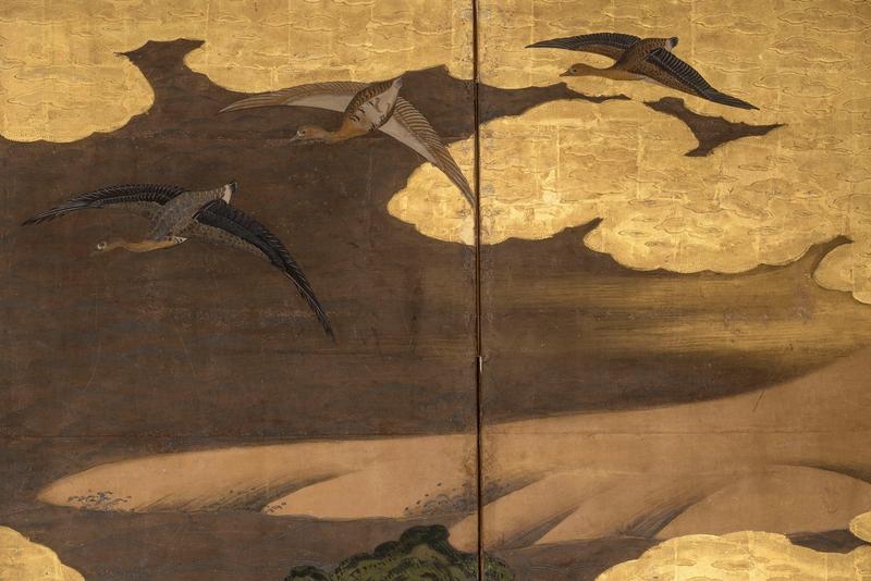 A six-fold paper screen painted in ink, colour, gofun (powdered shell), silver and gold leaf, depicting conifer and maple trees in autumn beside the Tatsuta River with three geese in flight amongst gold clouds rendered in moriage (raised design)