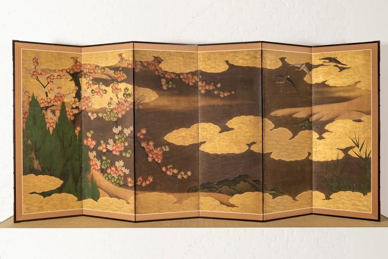SOLD _ A six-fold paper screen depicting conifer and maple trees in autumn beside the Tatsuta River with three geese in flight amongst gold clouds