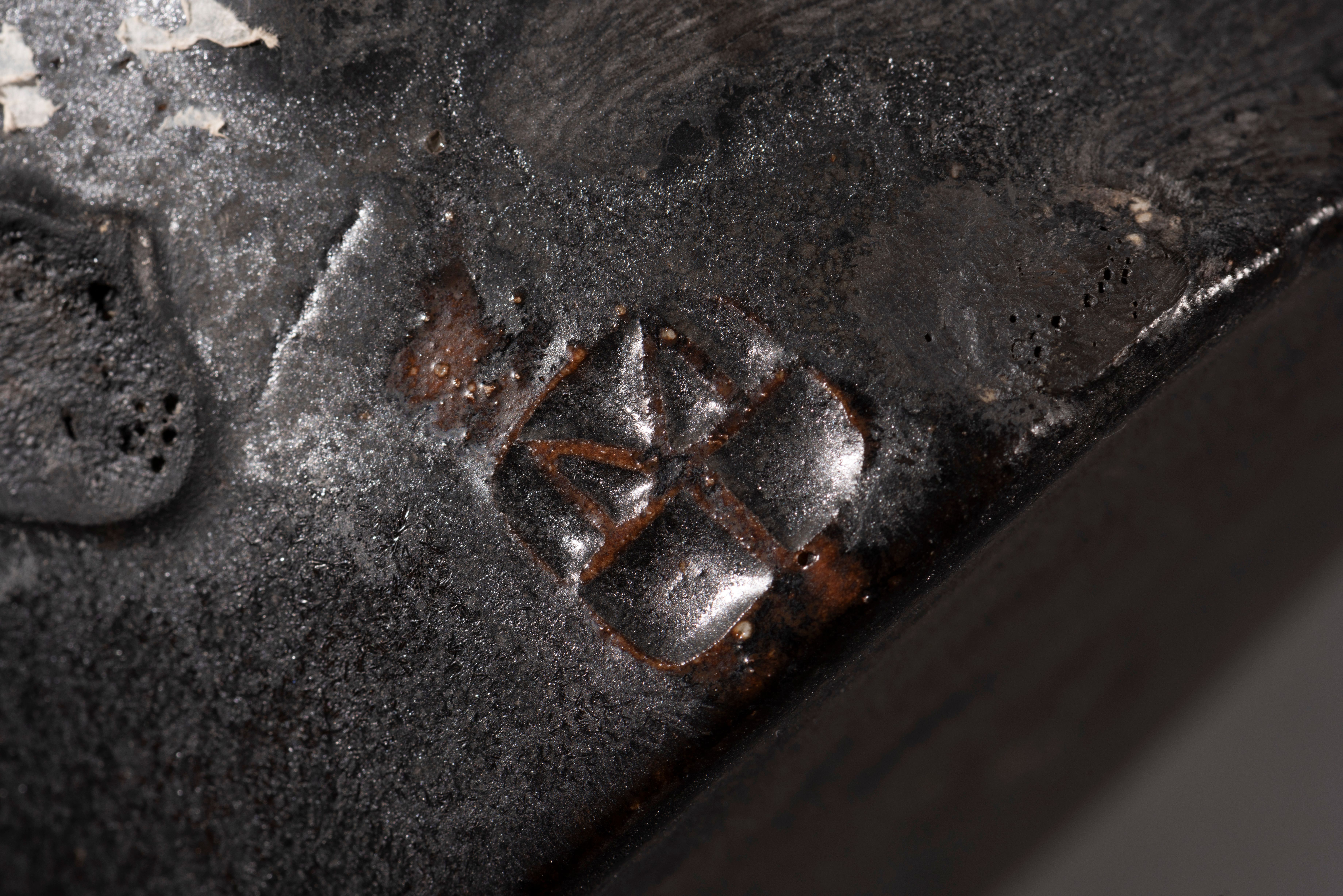 A ceramic vessel in black with an iridescent silver sheen in the form of a curving tube by Matsuda Tomiya (1936-2011).