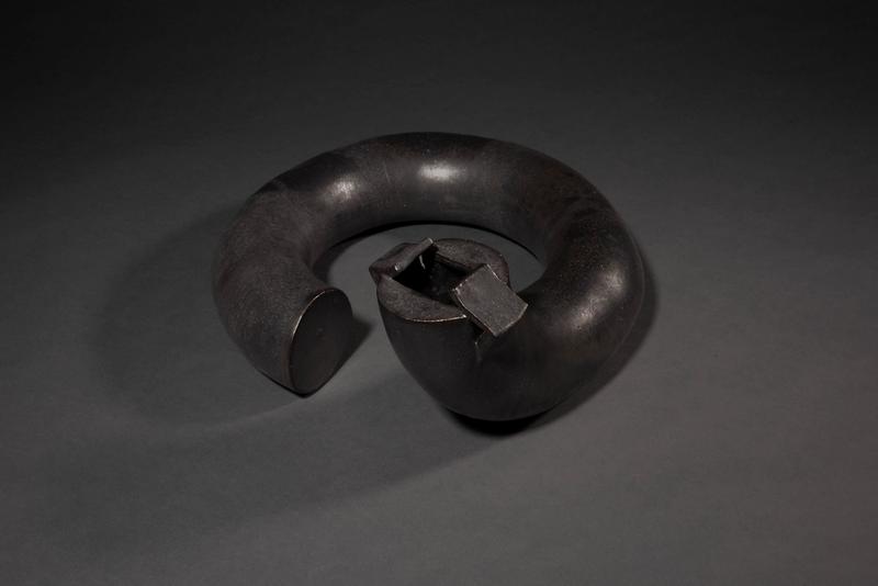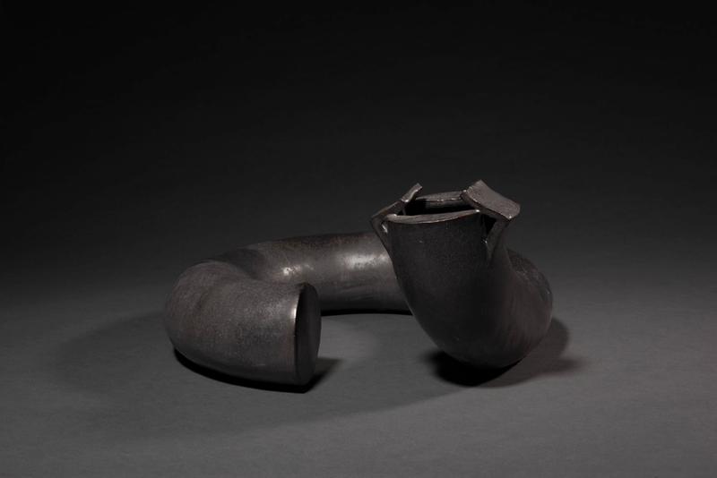 A ceramic vessel in black with an iridescent silver sheen in the form of a curving tube by Matsuda Tomiya (1936-2011).