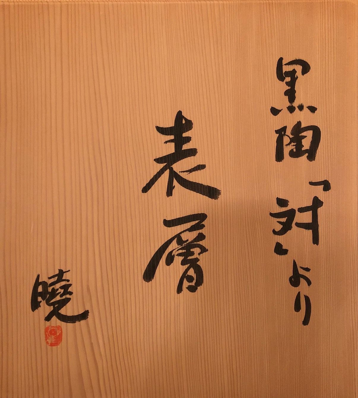Titled Kokutō “Tsui” yori Hyōsō (Surface Strata from “A Pair” in black ceramic), signed Satoru and sealed Hoshi.