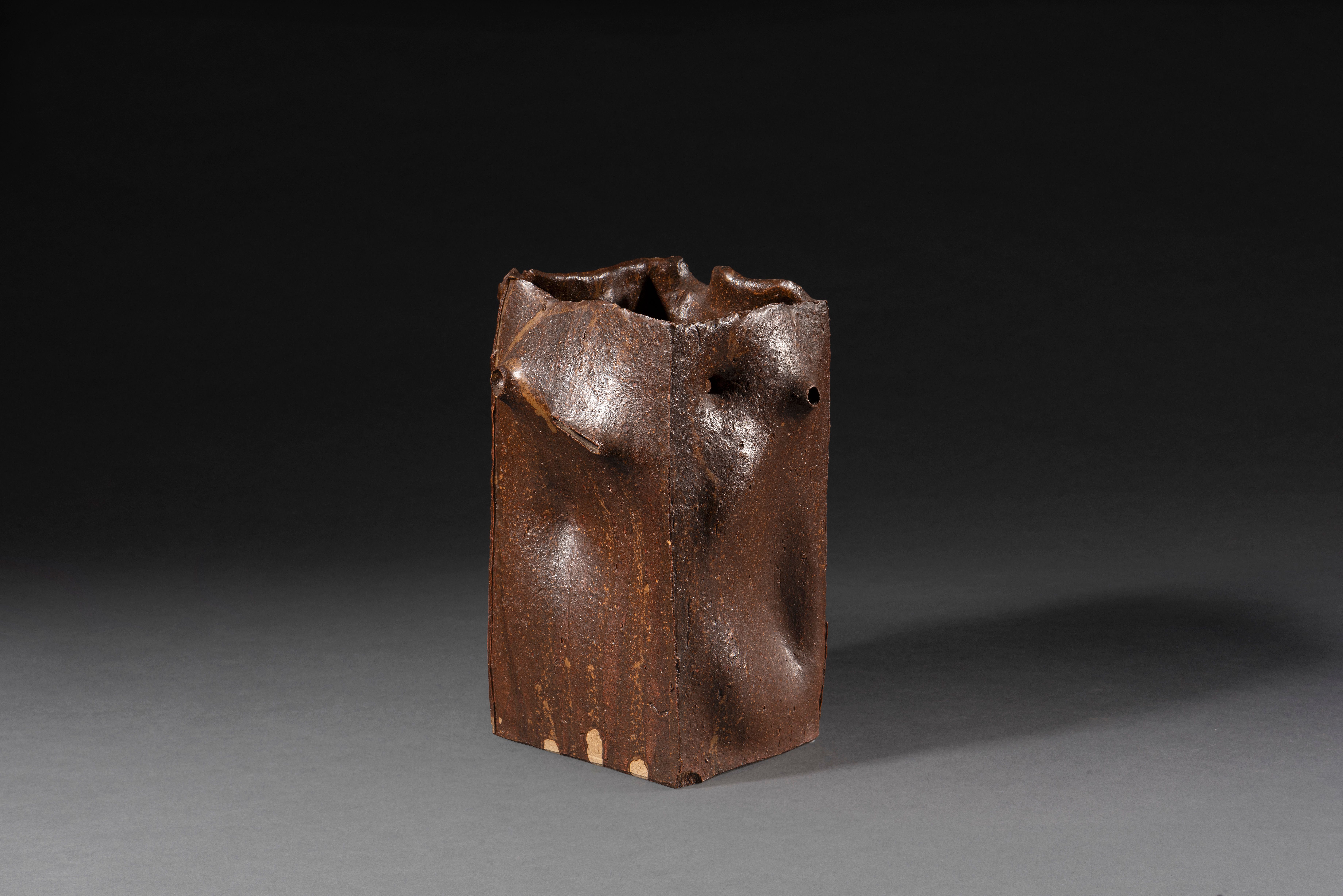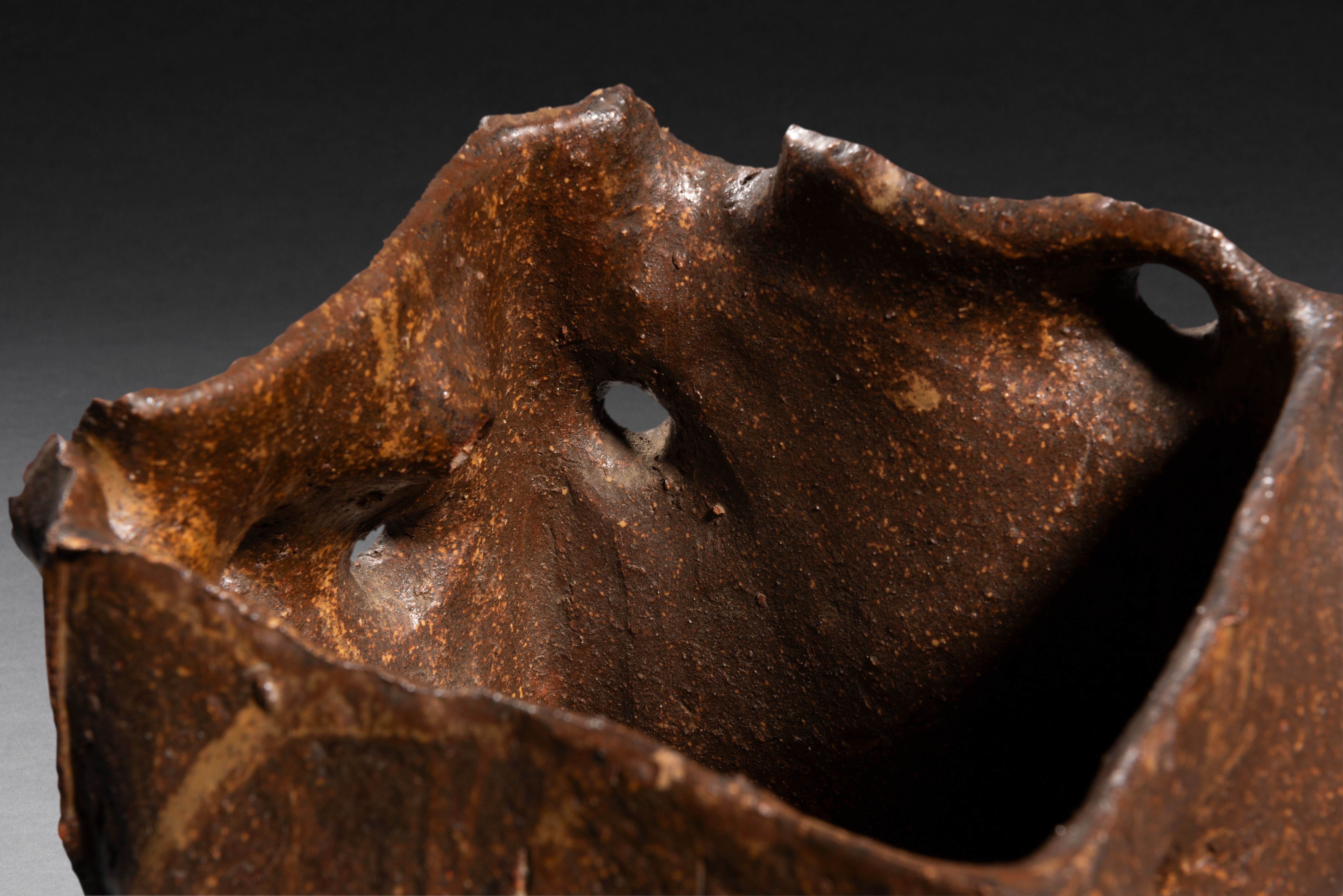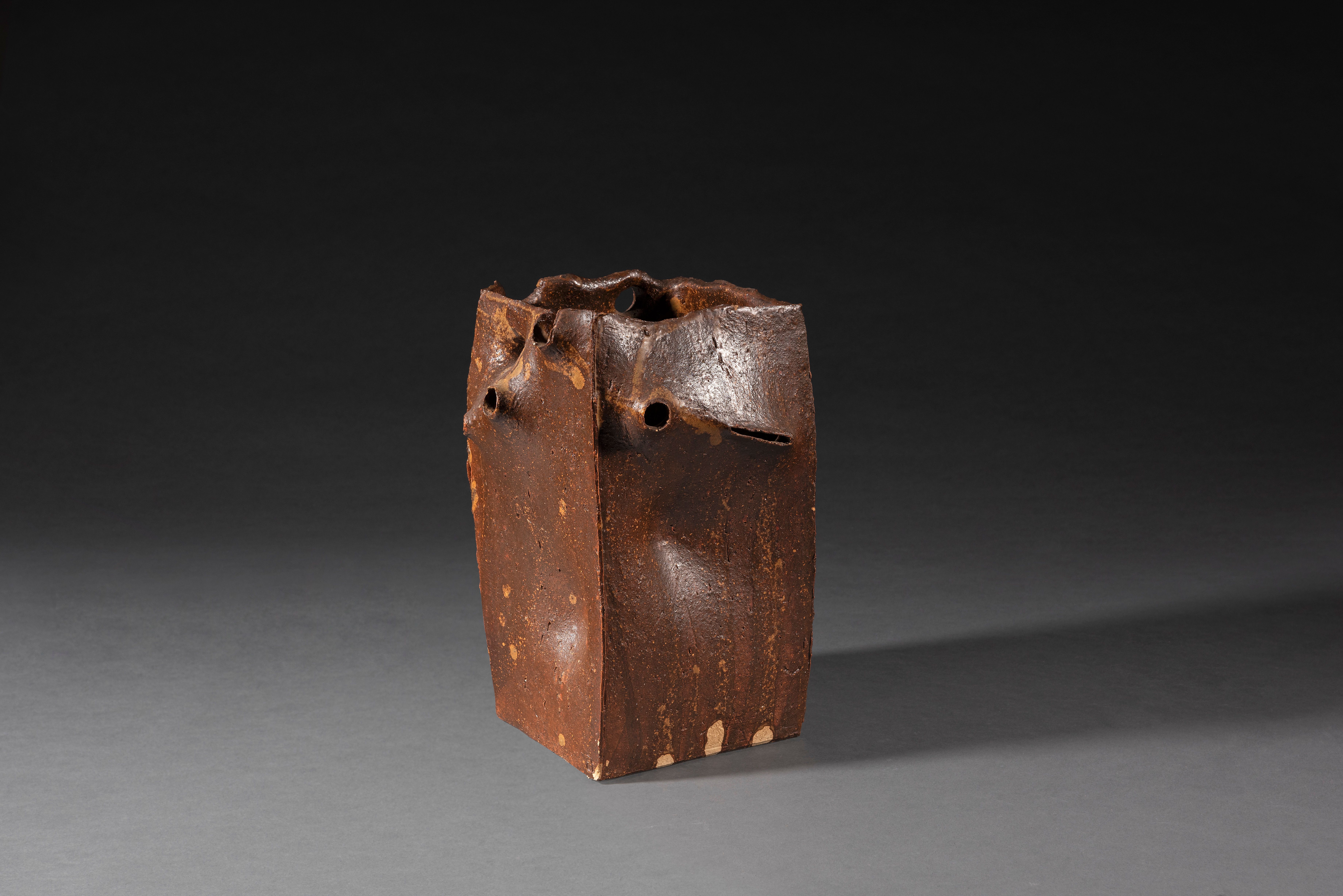 A square pottery flower vessel with random holes, decorated in an Irabo glaze by Suzuki Osamu (1926-2001).