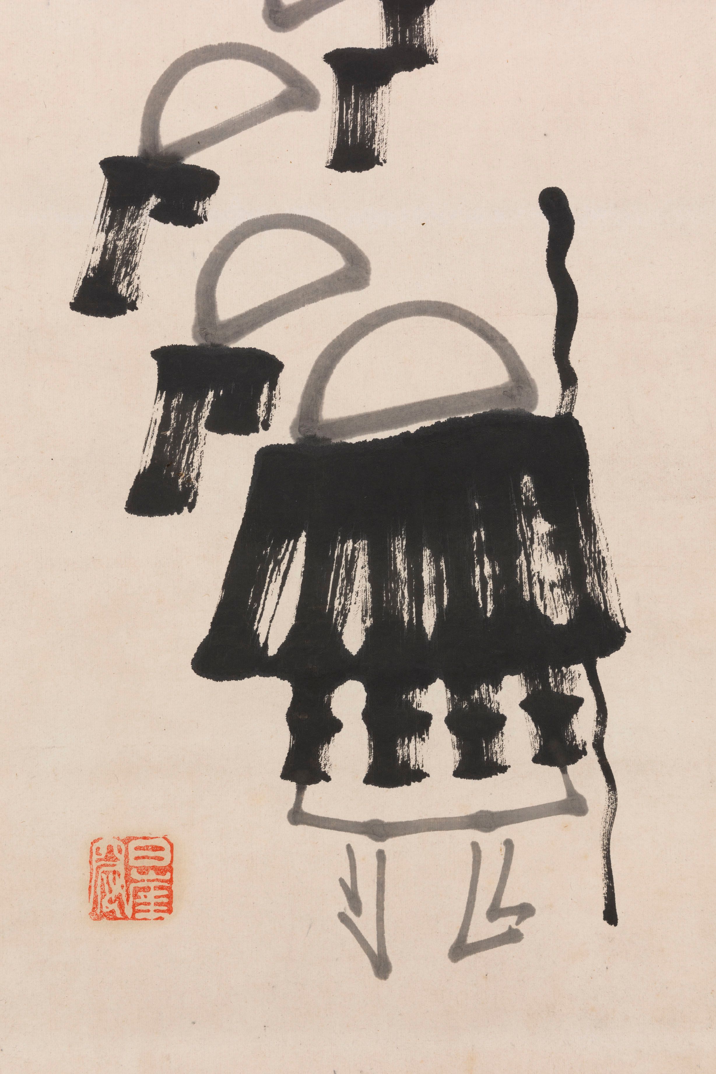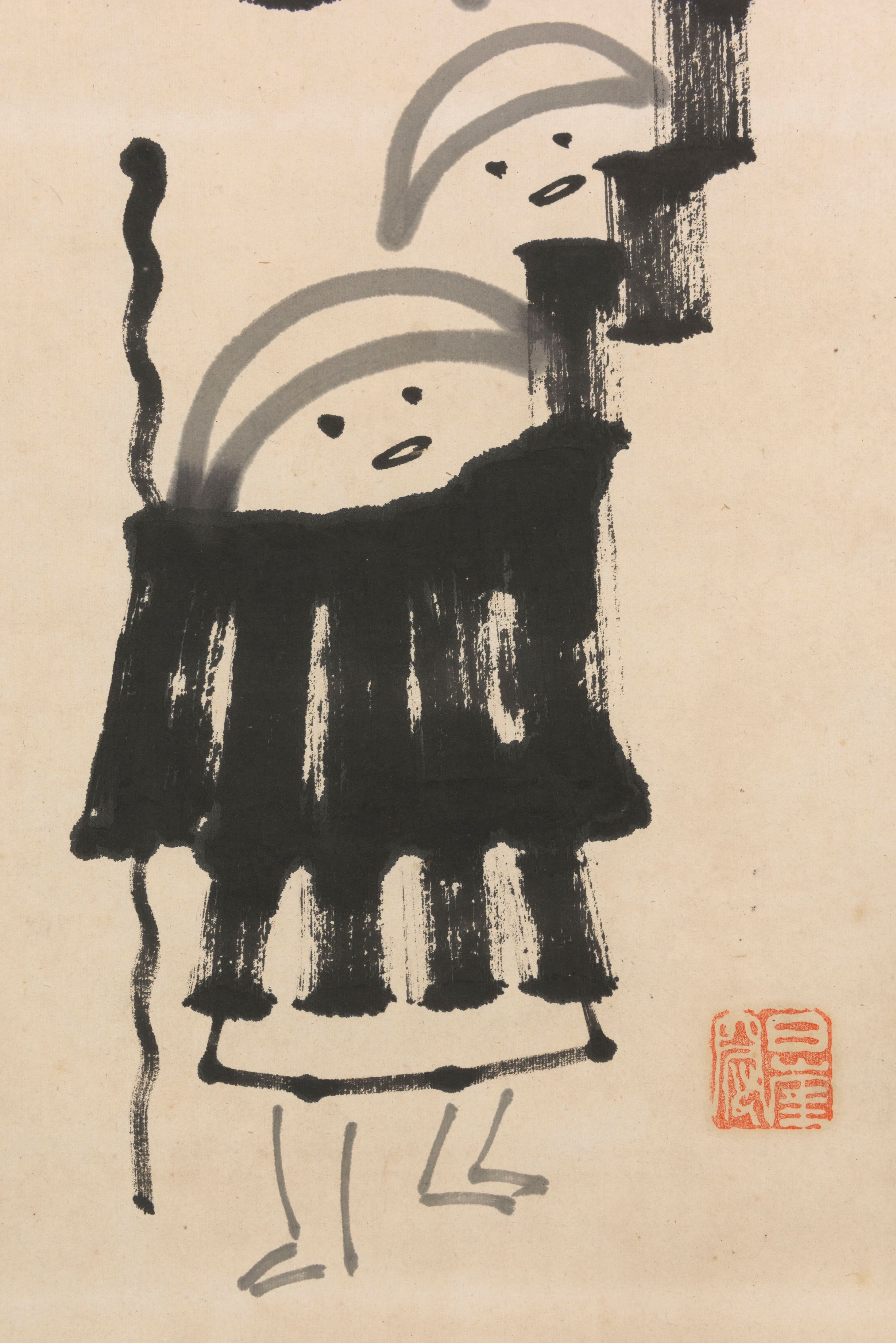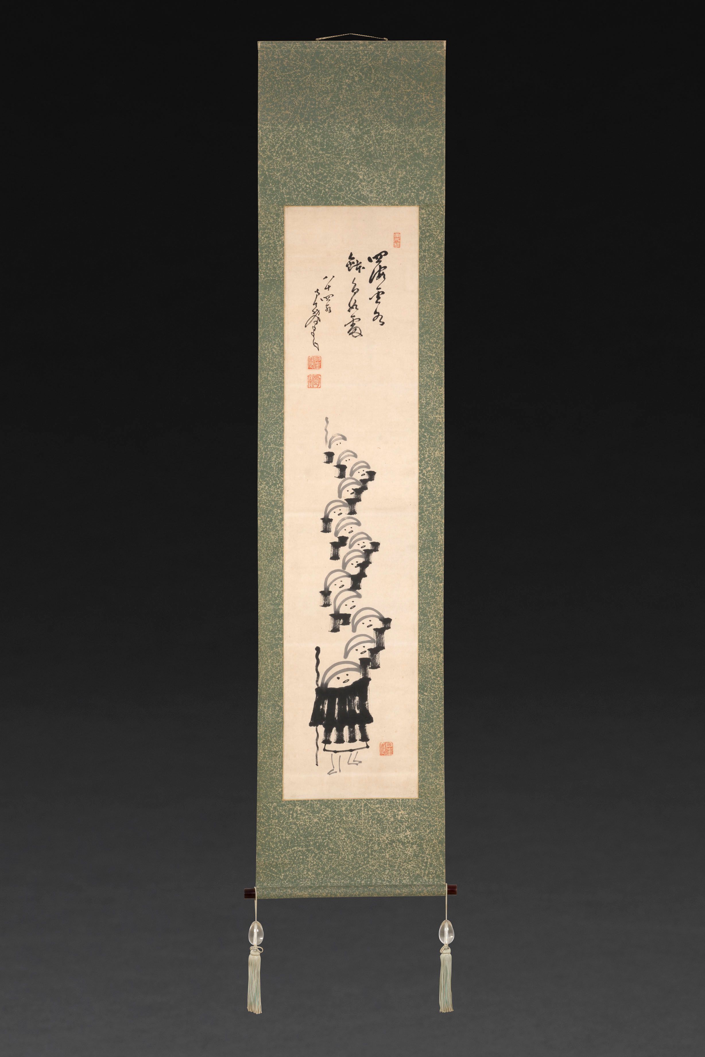 A pair of kakemono (hanging scrolls) painted in ink with calligraphy, depicting itinerant, mendicant monks in procession by Nakahara Nantenbō (1839-1925).