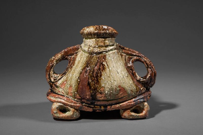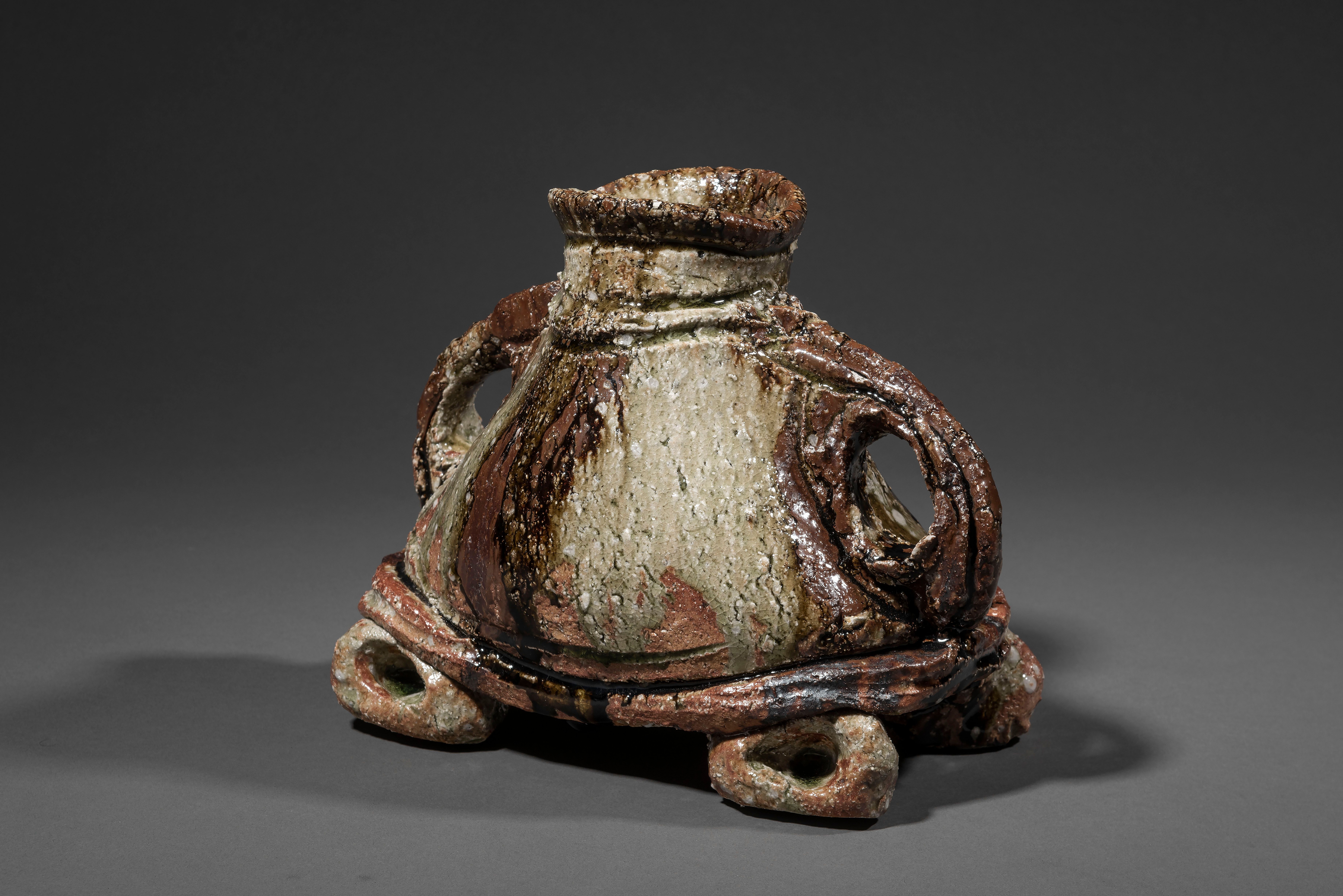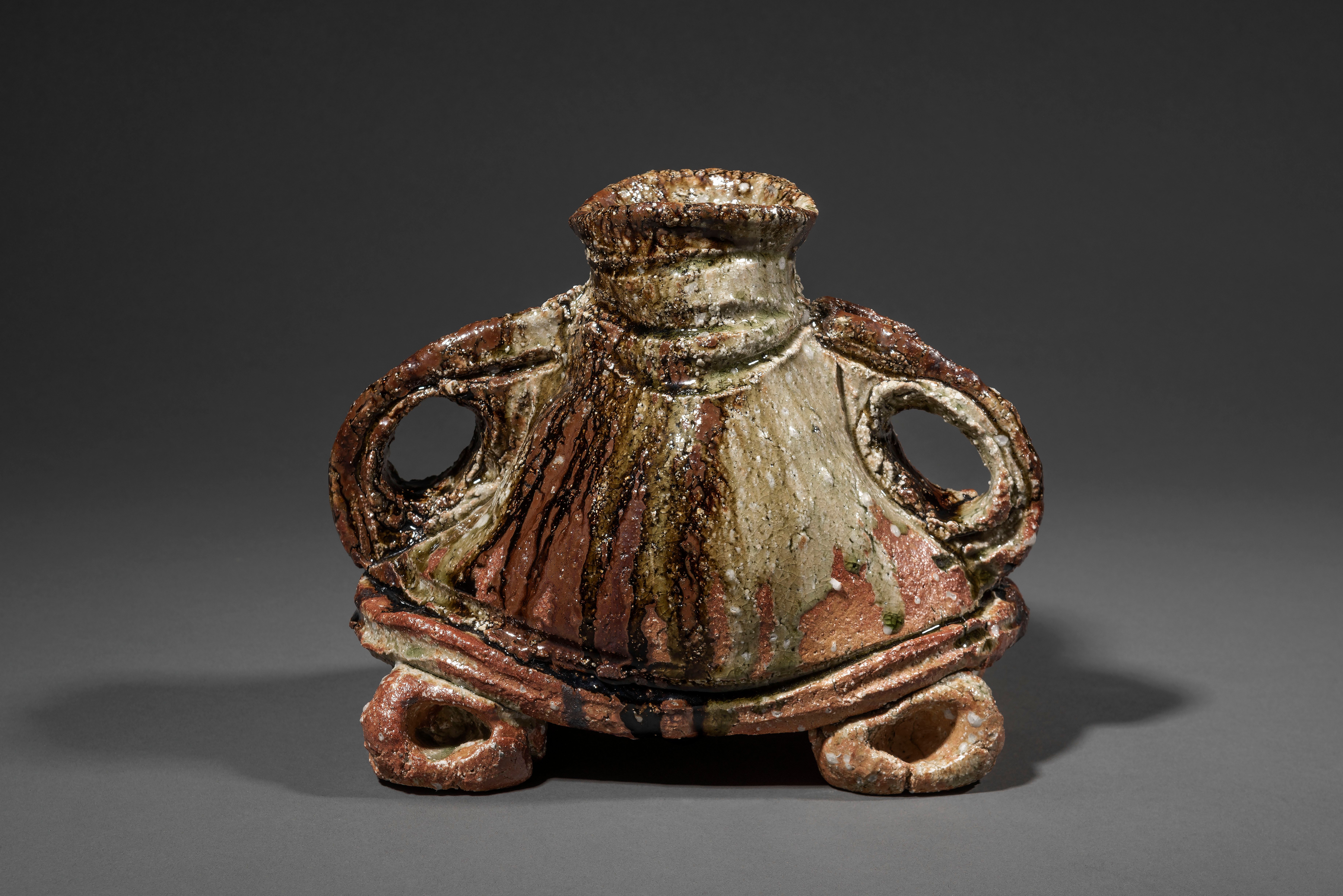 A large Shigaraki pottery vessel with a short neck, two handles and four feet, as if imitating a man whose hands are on his hips and feet apart, a reddish-brown body with rough texture incised and decorated in a thick green and brown ash glaze dripping down