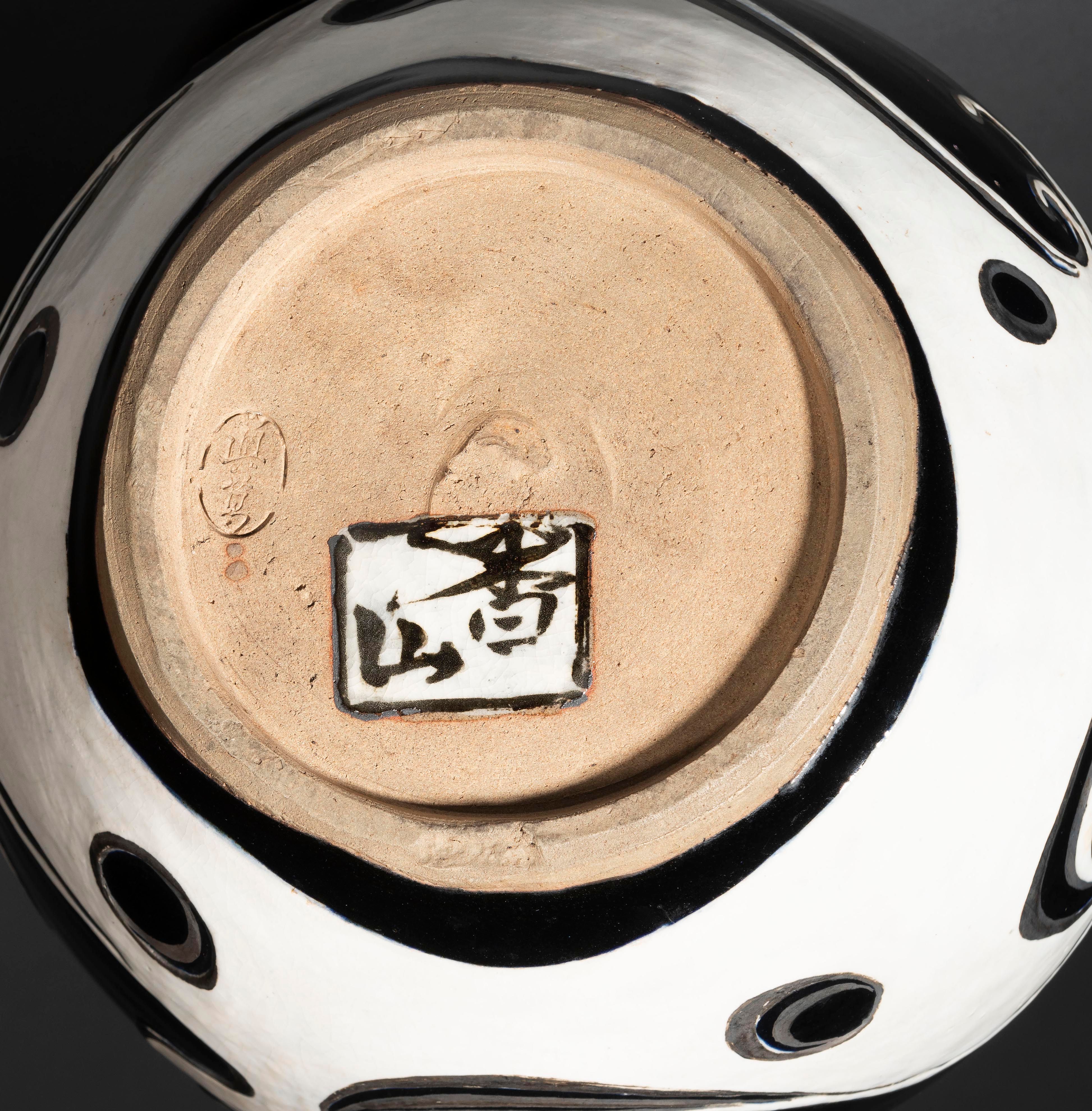 Inside: Makuzu-yō, kokuyū tatsunami no e (Makuzu kiln, black enamel standing waves decoration), Kōzan-saku (made by Makuzu Kōzan)